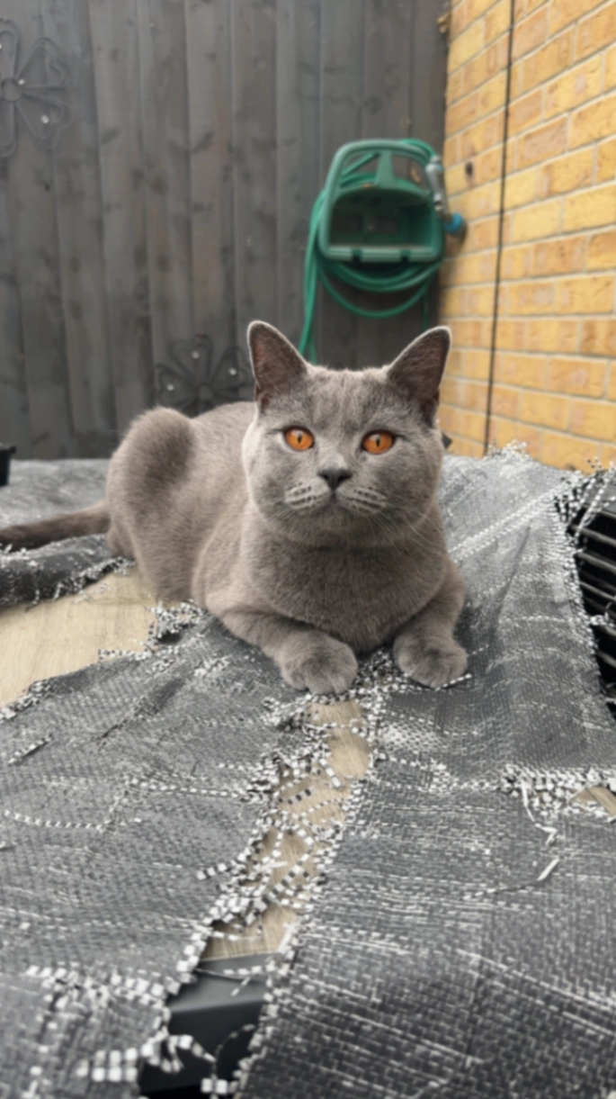 He is a long dark grey short hair cat about 5.8kg