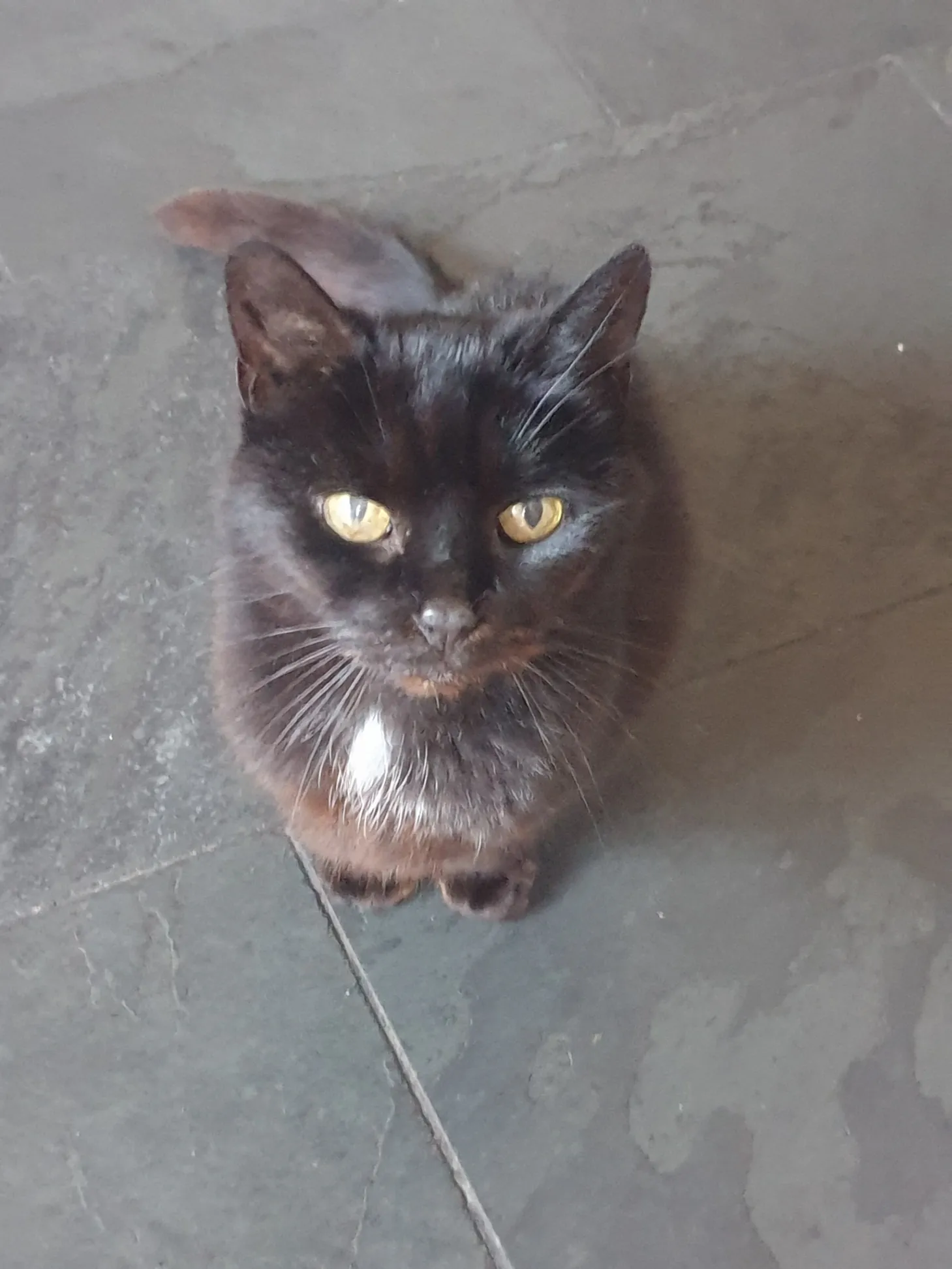 Helen is mostly black with a small white patch on her chest. She is very small for an adult cat with a tail that tapers at the end. She is missing most of her front teeth but has one front fang. She has extra toes on all of her paws, with what looks like little thumbs on her front paws. She is quite shy so may not come to you, but might be coaxed with a treat.