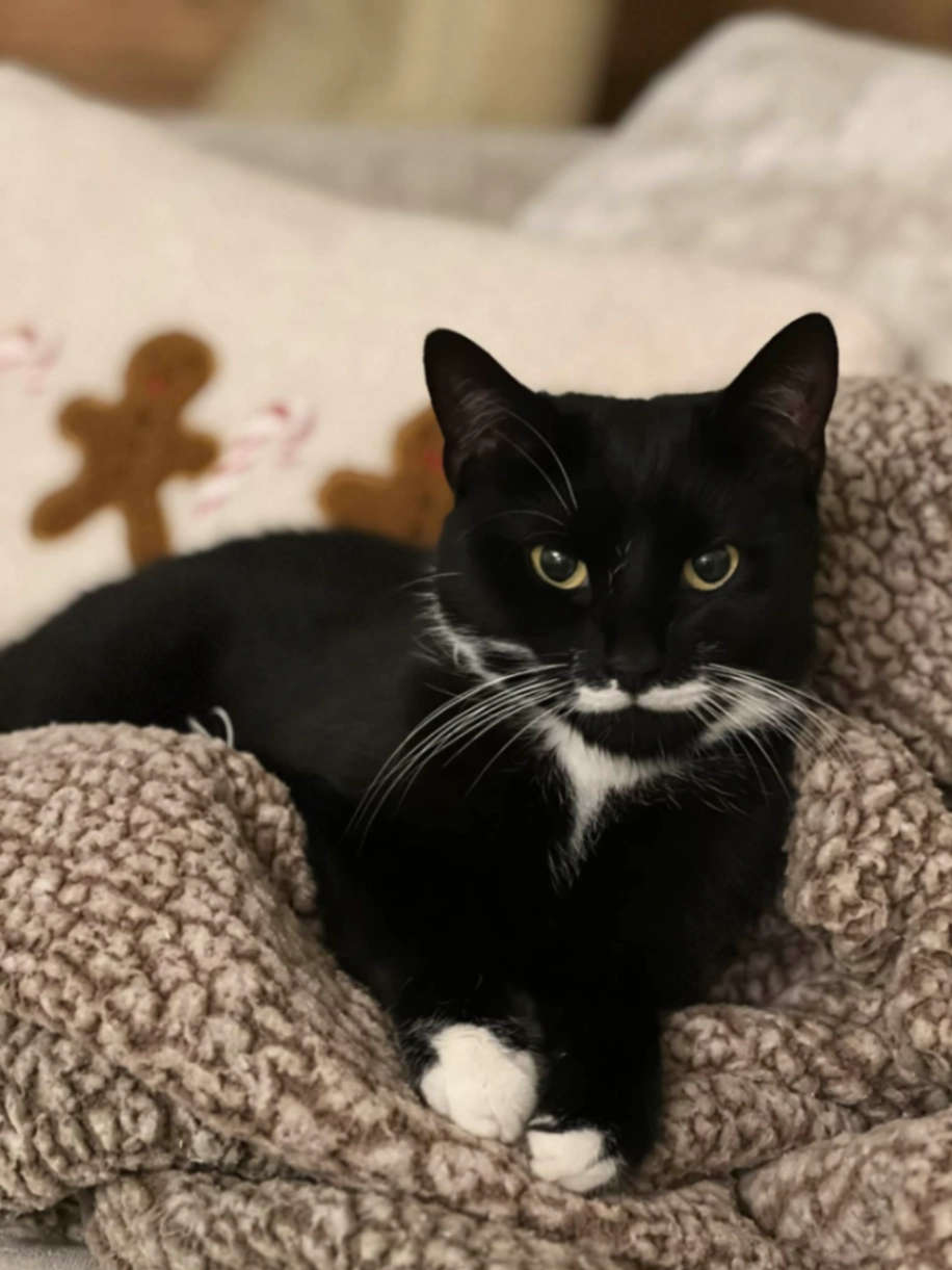 Smaller than average cats but he’s quite long, slightly skinny, white socks on paws, completely black tail, distinctive white marks by nose , hankercheif tuxedo neck , quiet meow, slightly scared of everything