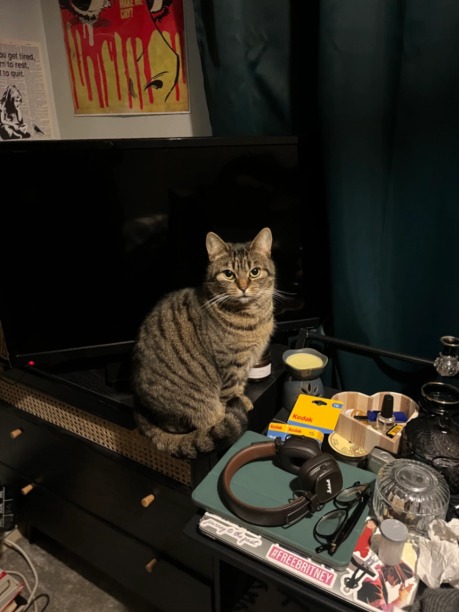 Grey/Black cat with a black line going down her back. With green/eyellw eyes.