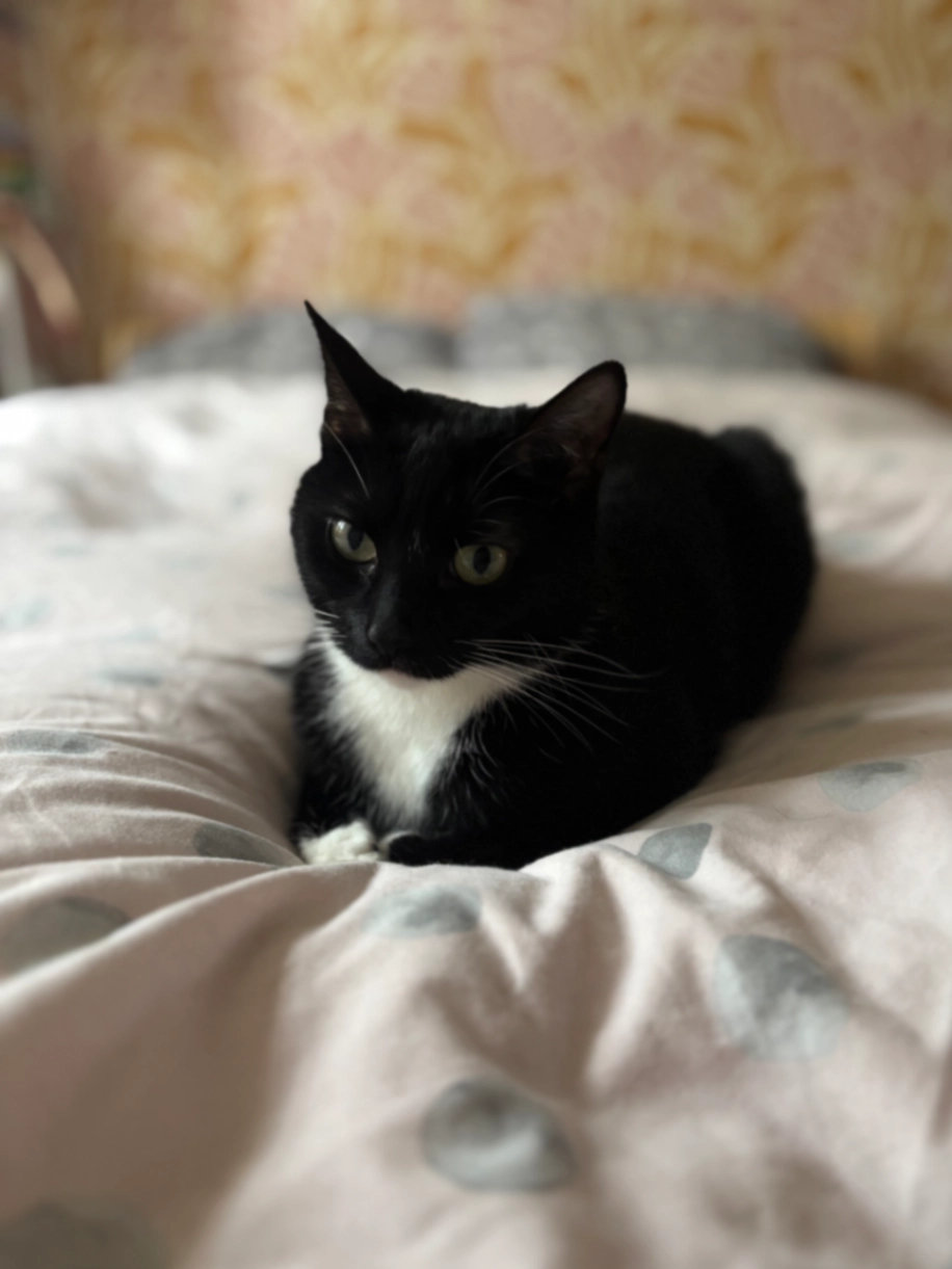 2-year old tuxedo cat. She has white paws, chest and tummy. Green/brown eyes. She’s quite small at around 3.5kg. Very curious and friendly and loves a treat.