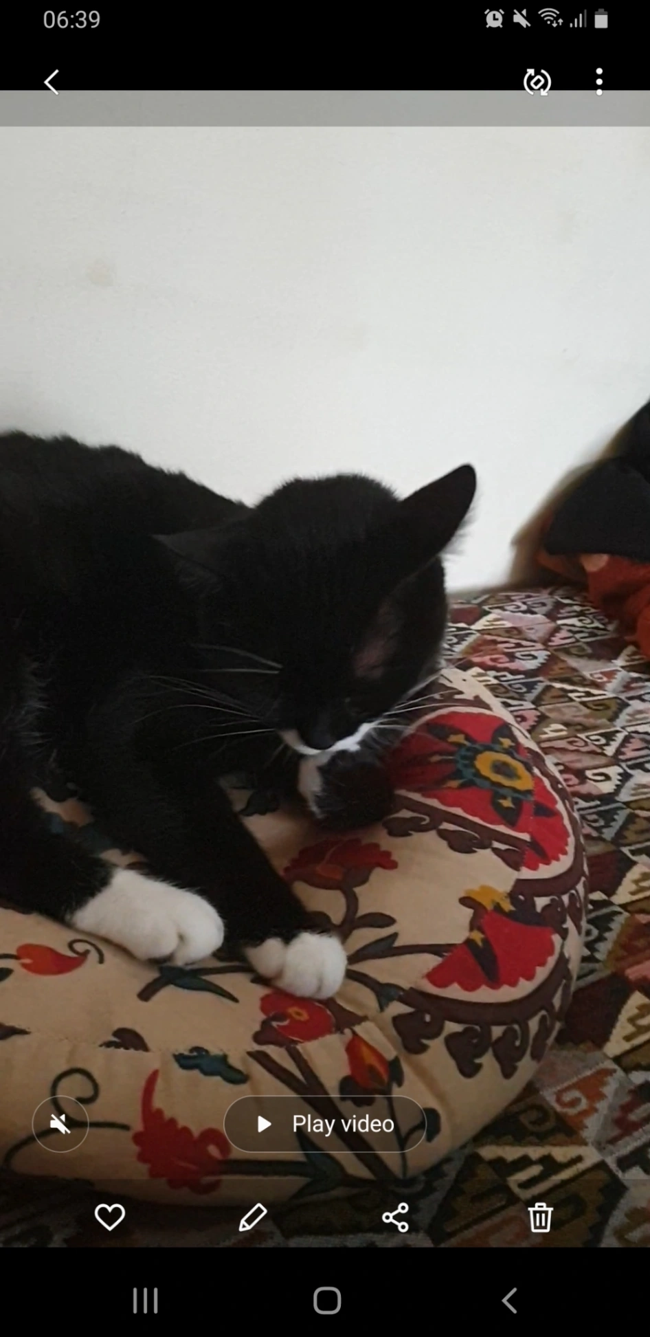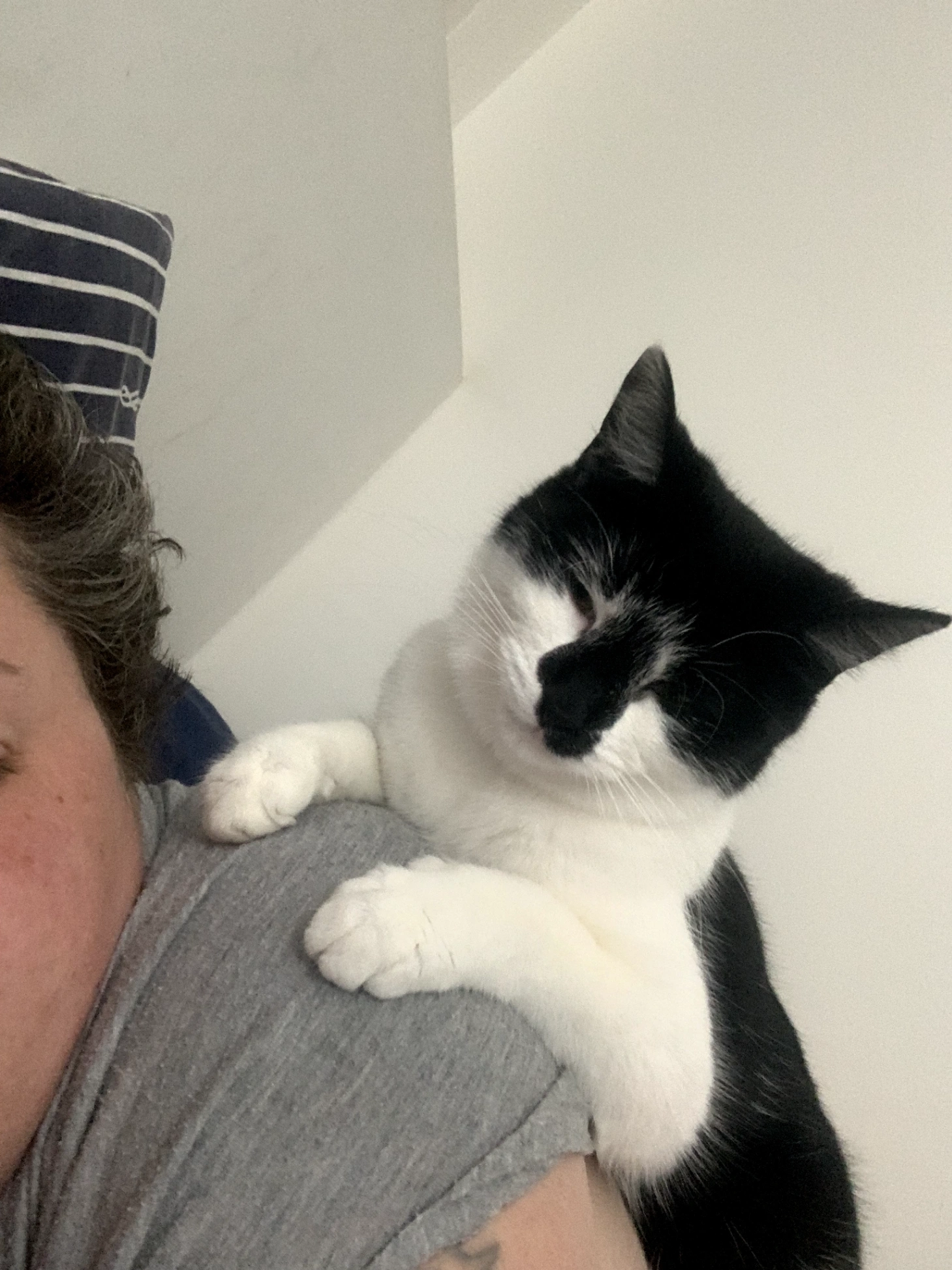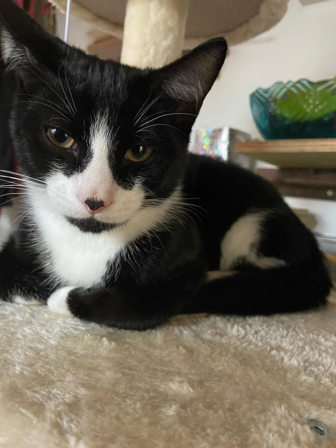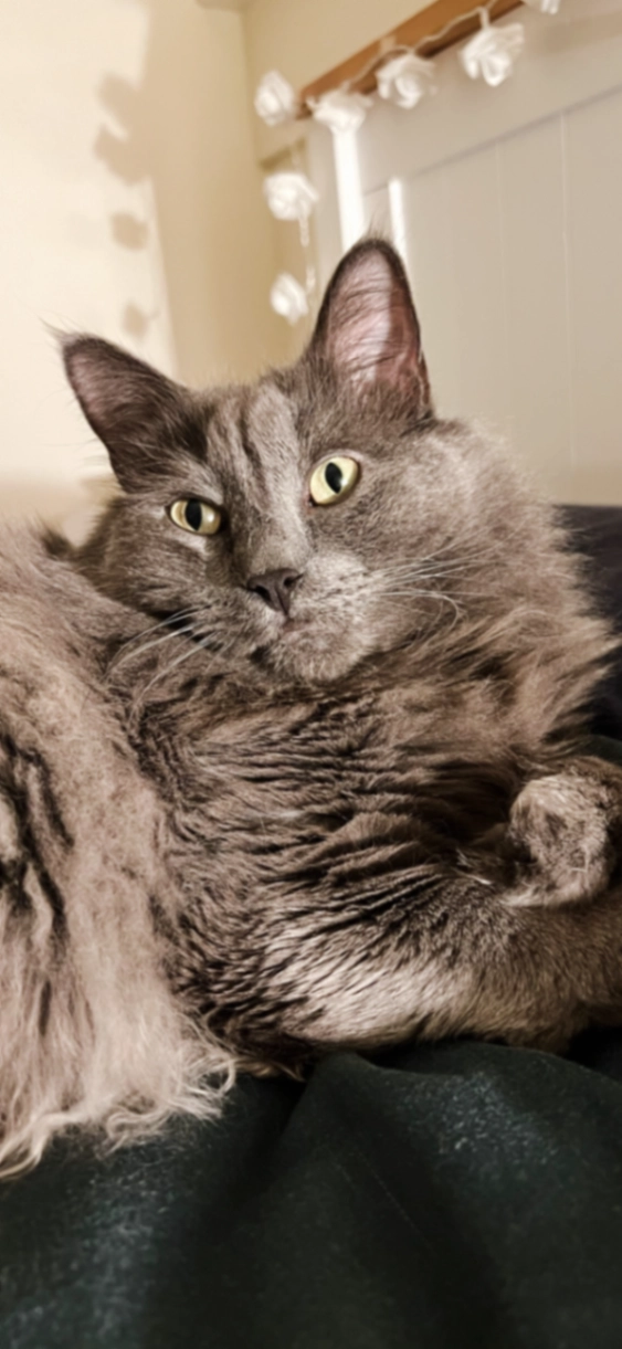 She has a small scar just under her nose, she also sits with her left paw tilted outwards due to an accident she had as a kitten, her meow is quite deep,