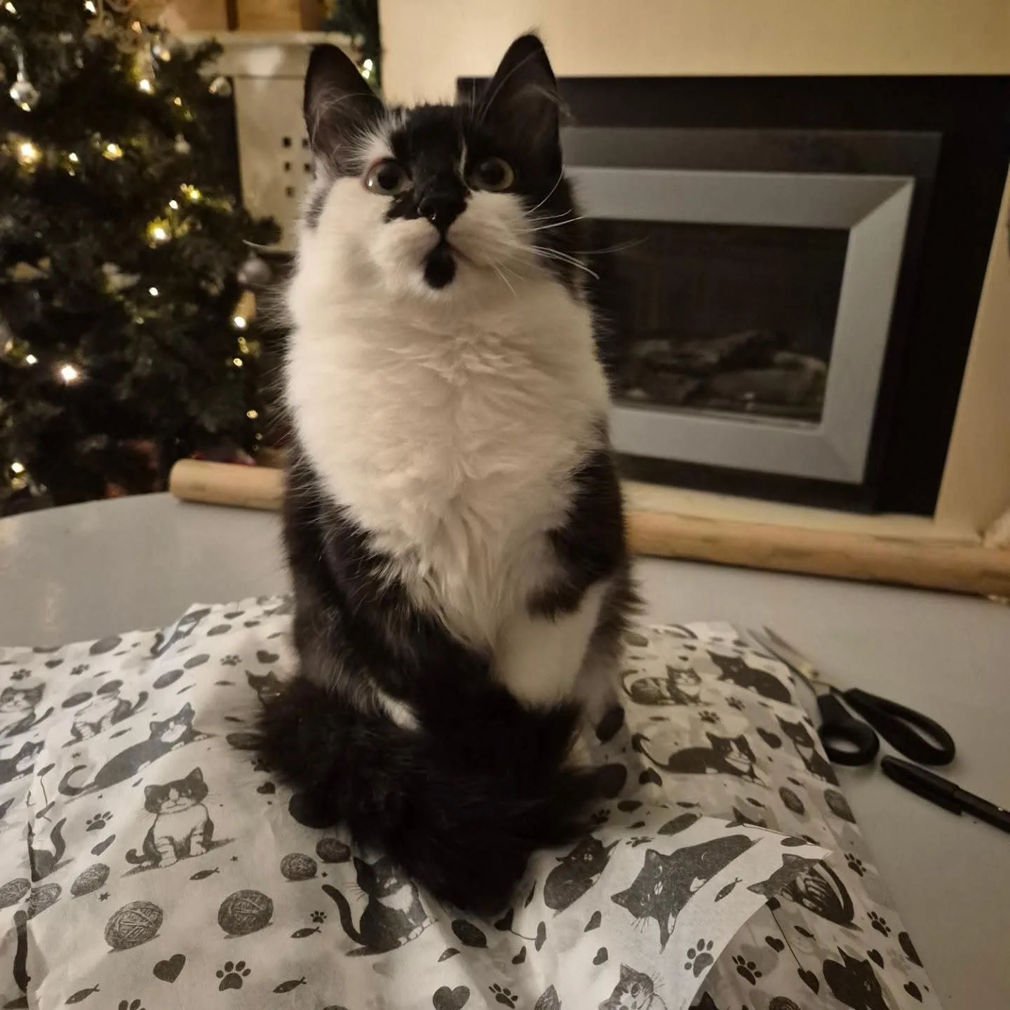 Black and white long haired male. 7 months old. Neutered, microchipped and wearing a blue collar with white paw prints with a blue tag with his name & phone number on.