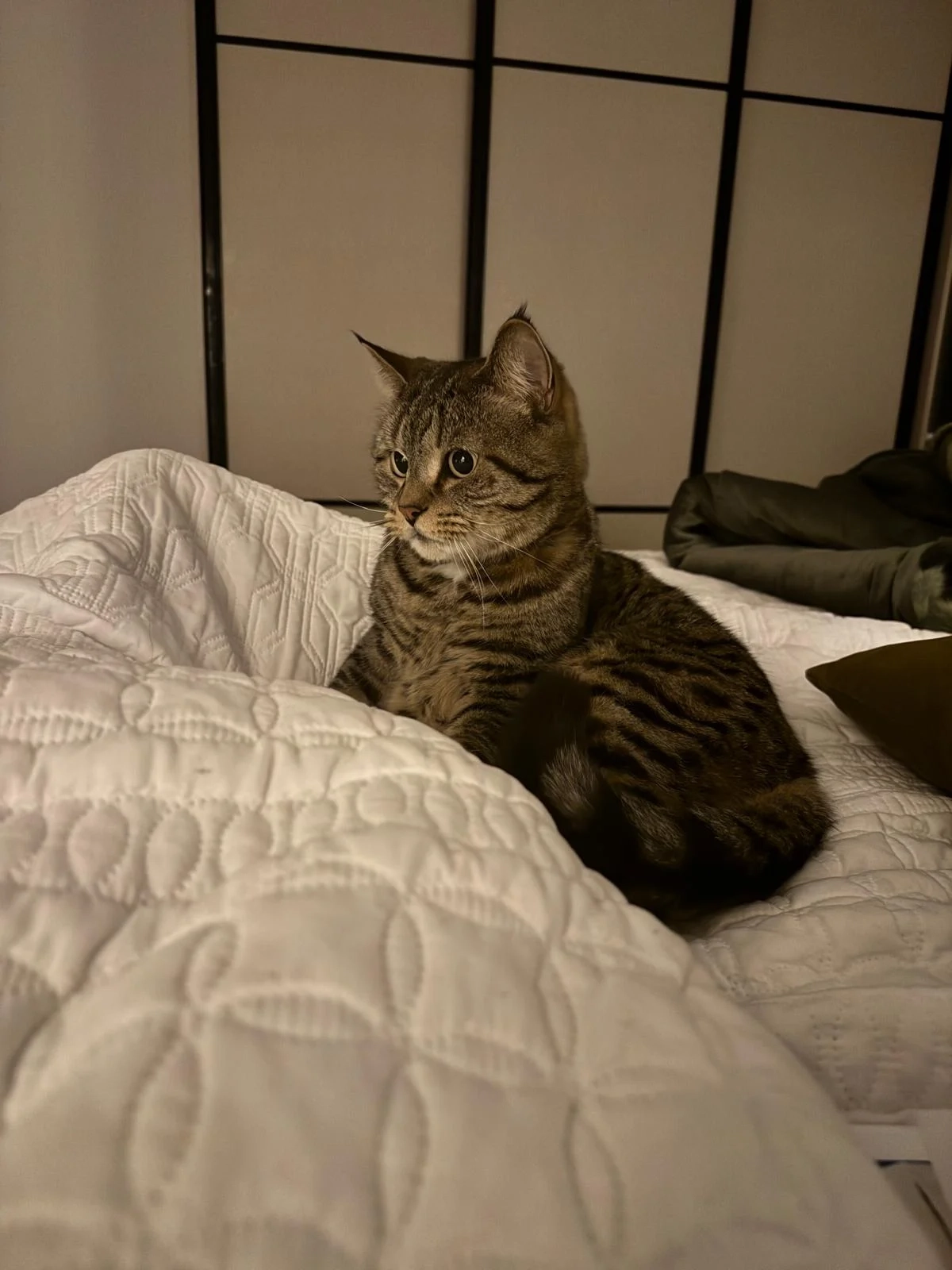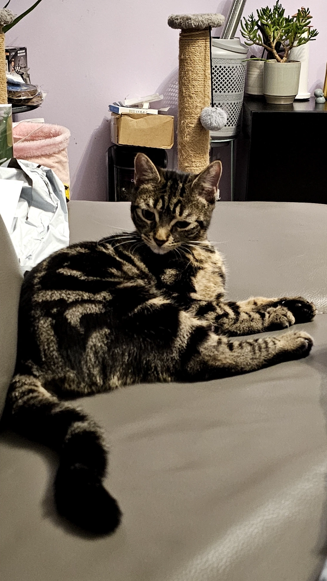 White underbelly and legs, grey and beige tabby pattern