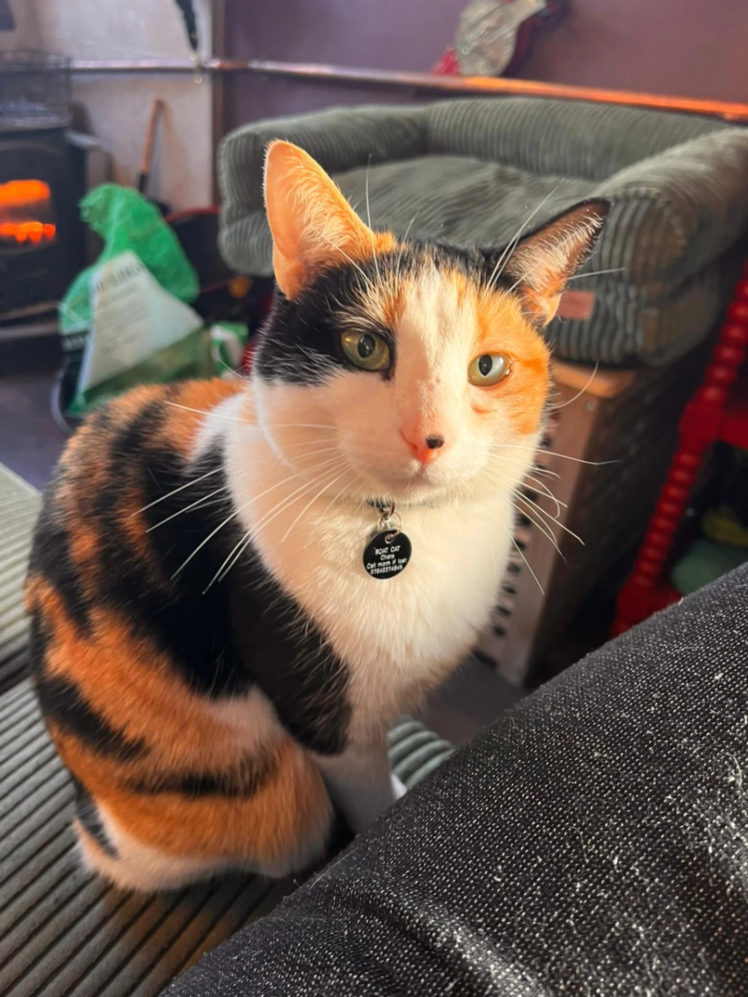 Small calico cat, people often think she's a kitten, Black collar which reads "BOAT CAT Chata". Last seen 14 Jan 8pm.