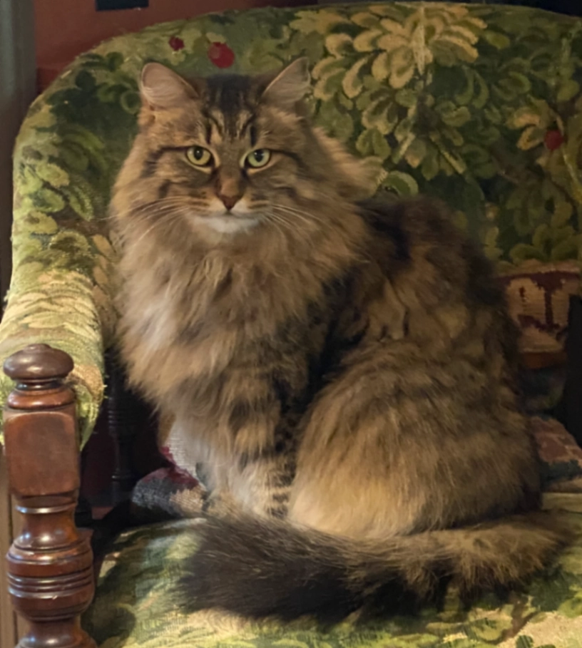 Duke is a 5 year old boy. He is fluffy and a fluffy tail and has a dot in the left eye area.