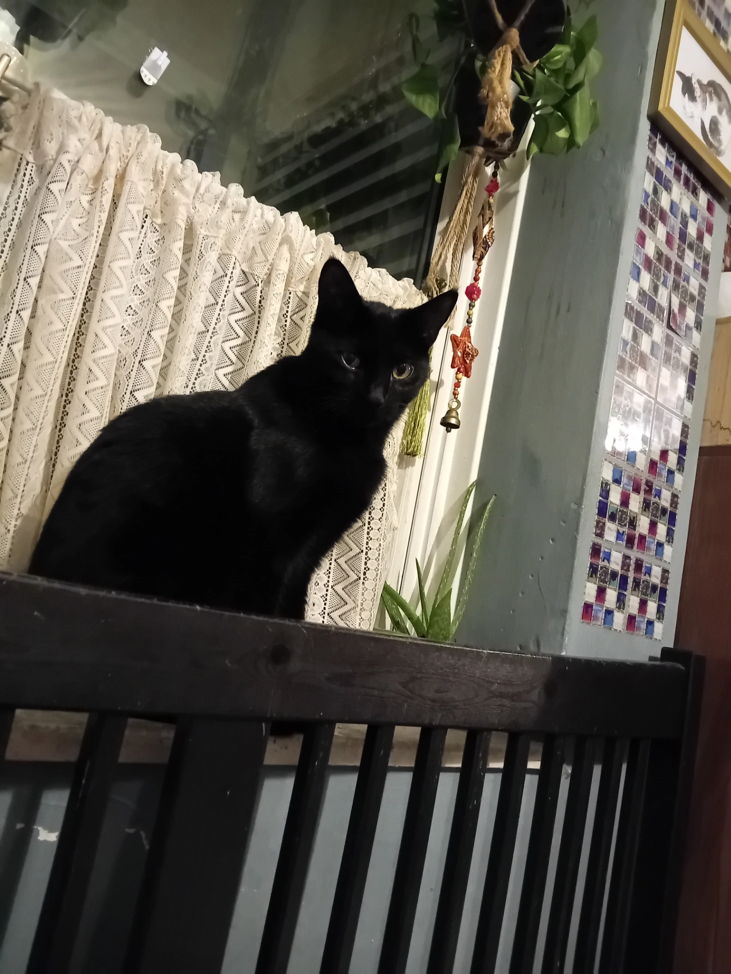 All black female cat, 1 year old, has a shaved patch on her side from a recent spay operation. Shes never been outside so may be very distressed