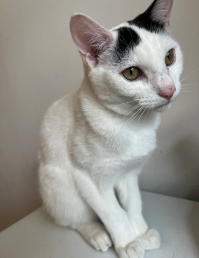 Duke is chipped, and neutered and has a dot in one of his eyes. The dot is what stands out mostly about him.