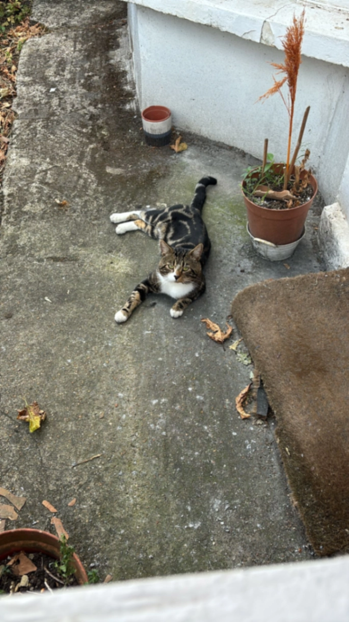 Small slim brown/grey tabby female with white chest and white paws, green eyes, short hair, and medium-length striped tail. Not spayed. Microchipped, no collar. Friendly and curious. Recently moved to the area.