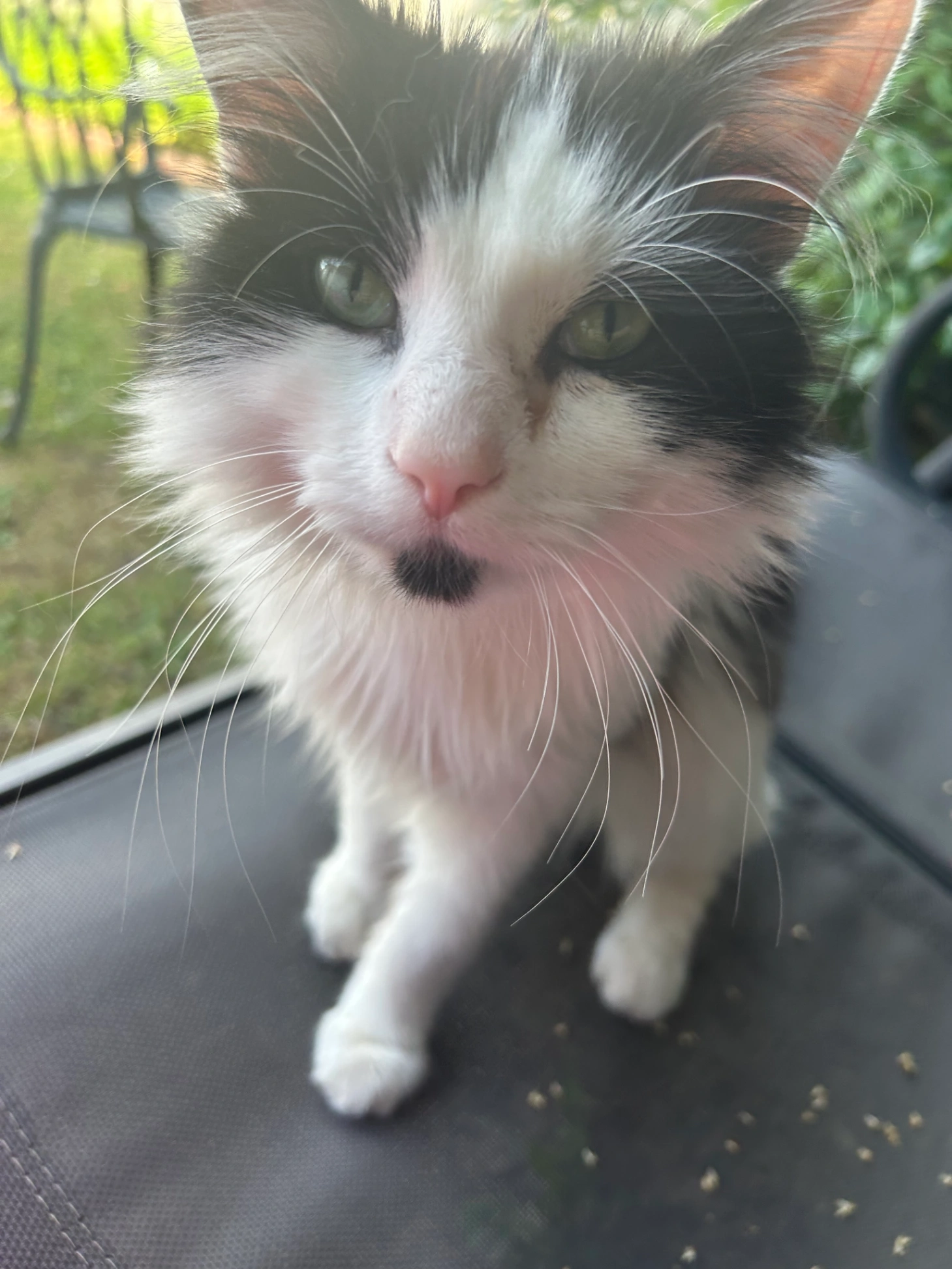 Has a small black goatee and green eyes. Hasn't been with owners since December 2025