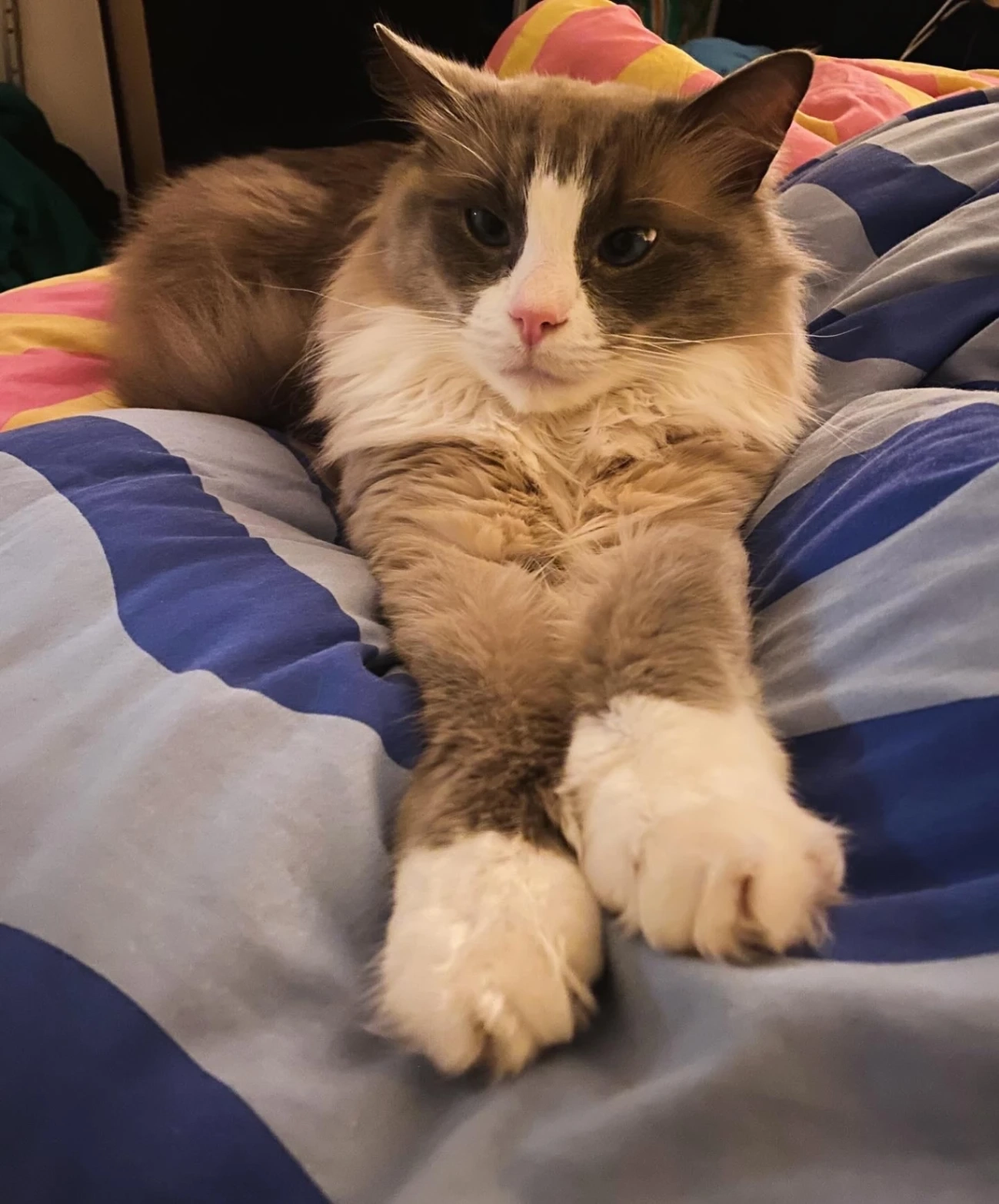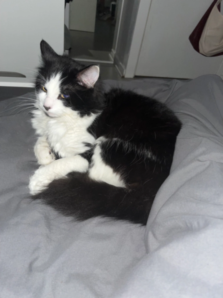 Grey and white, pink nose, long haired, white socks on his paws, can be quite chatty, very friendly, is microchipped