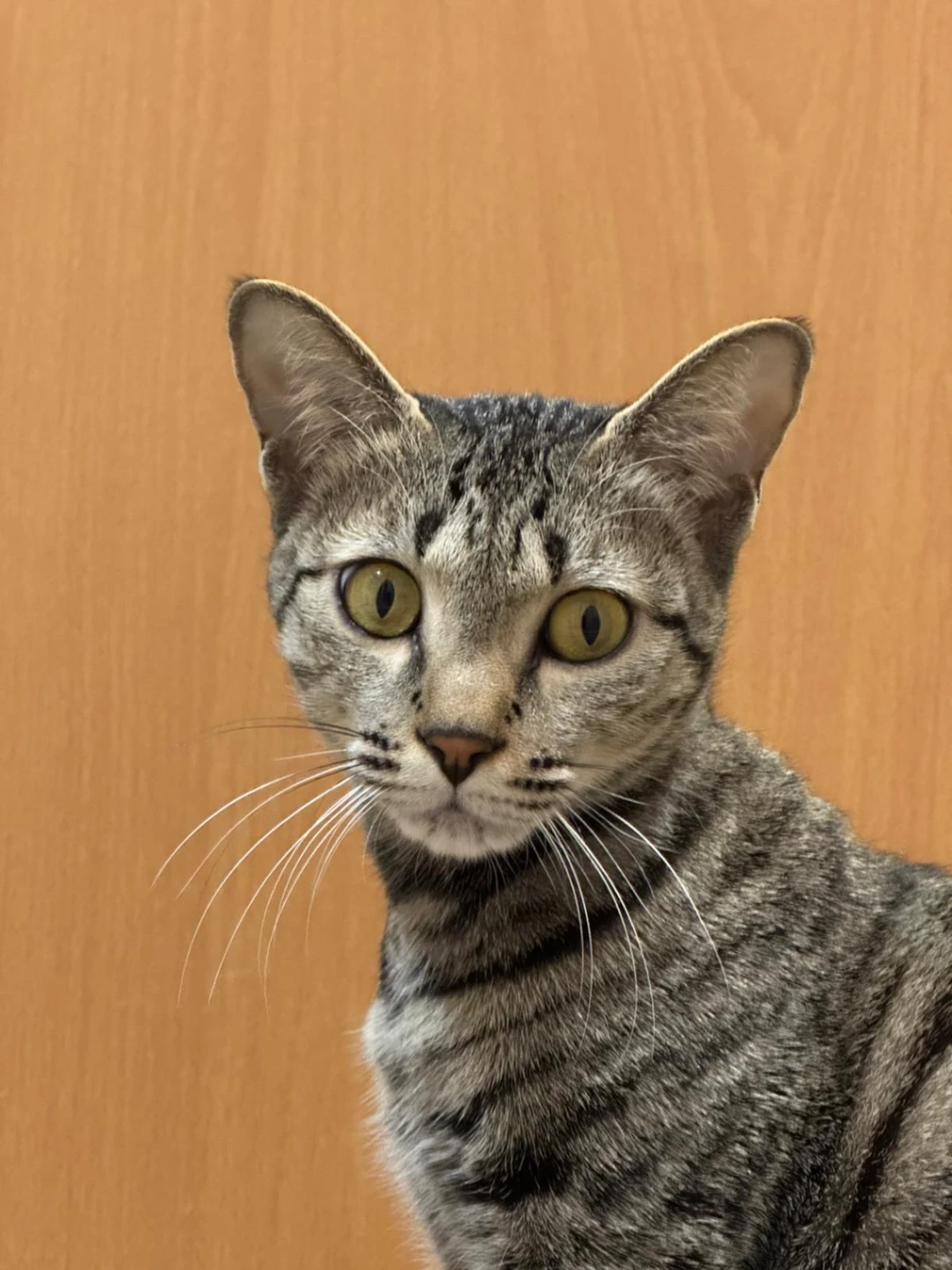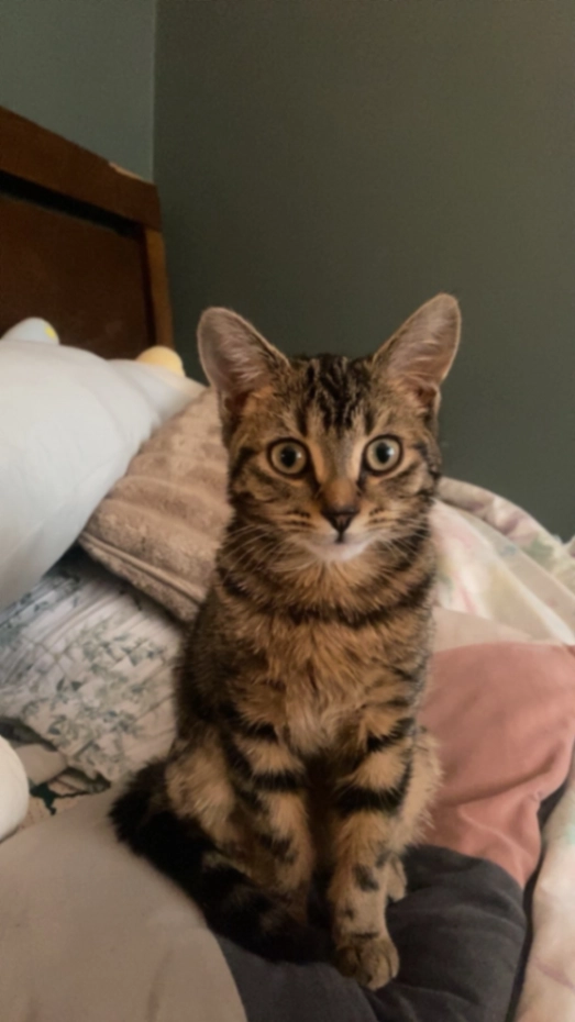 She's a microchipped tabby cat grew up on the indoors. She has a very small face a cute one and very deep eyes and grey ish skin
