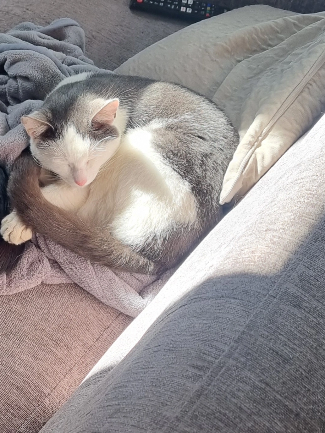 He is a dark grey and white tomcat, pink nose, healthy looking cat