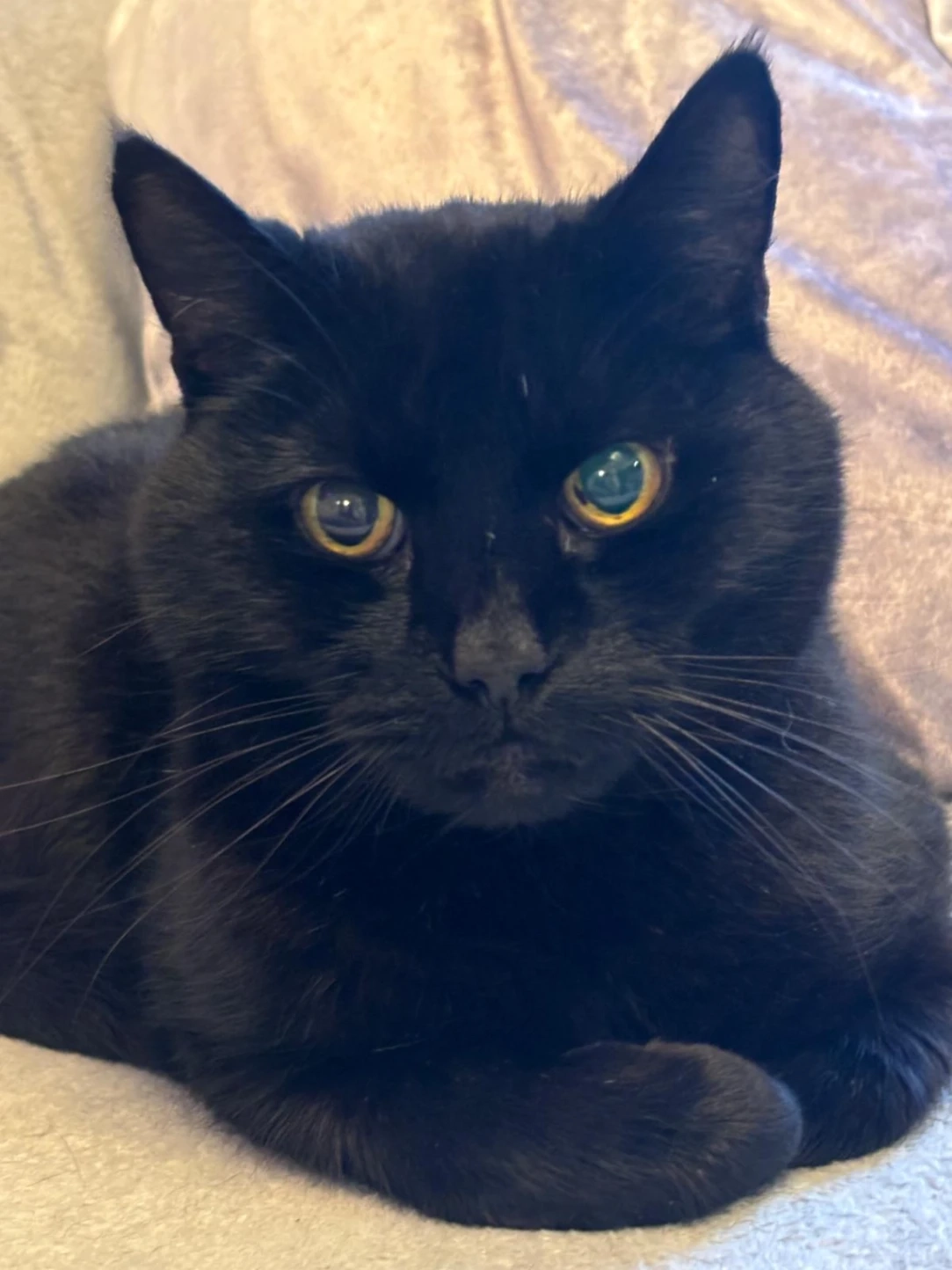 He is all black, but has a defect in his left eye and hair growing back on each side of his body due to a recent scan he had. He is microchipped.