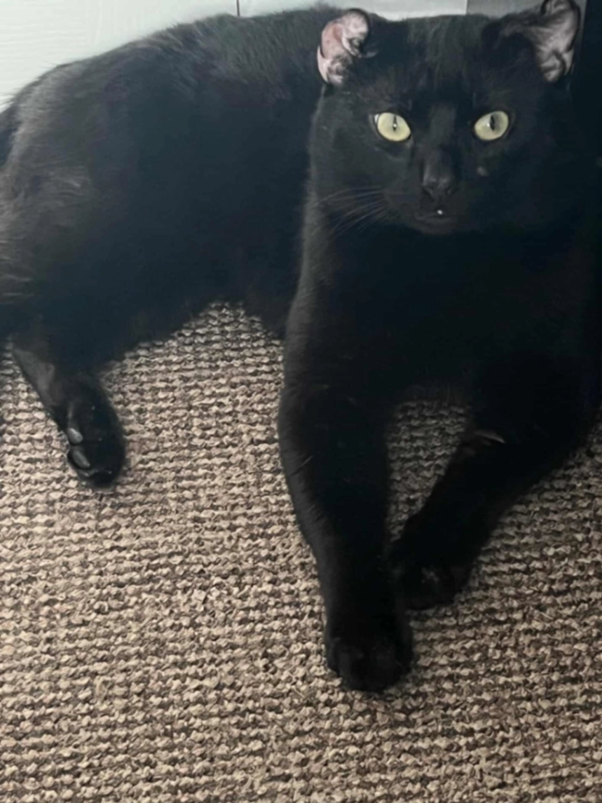 He’s microchipped as well. Anyone who takes him to the vet, can scan the microchip and would give him all the info. Also, he’s ears are not straight but a bit crumble. He’s all black and a bit without hair at around his eyes