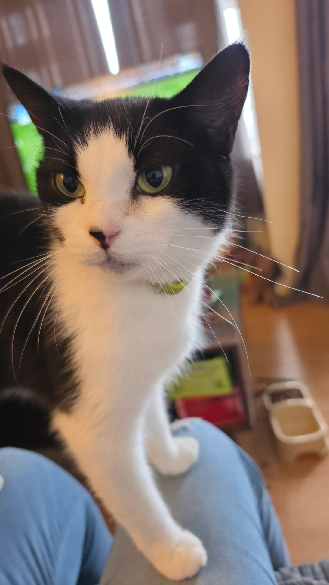 Topaz is wearing a black collar with diamontes and two bells