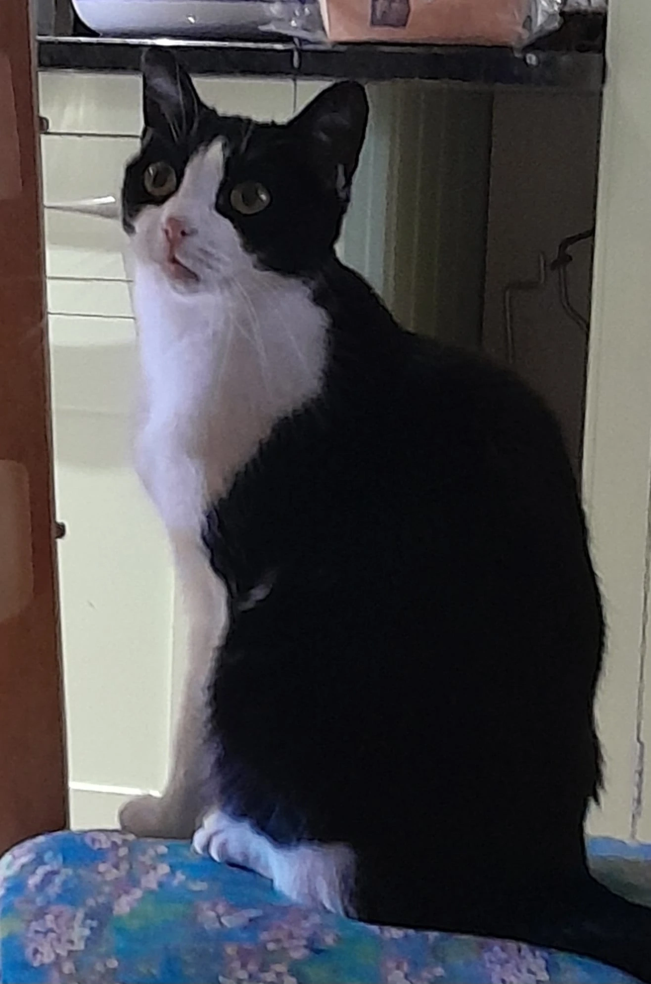 12 year old black and white female, looks like the Felix cat. Quite nervous. Rarely strays far from home.