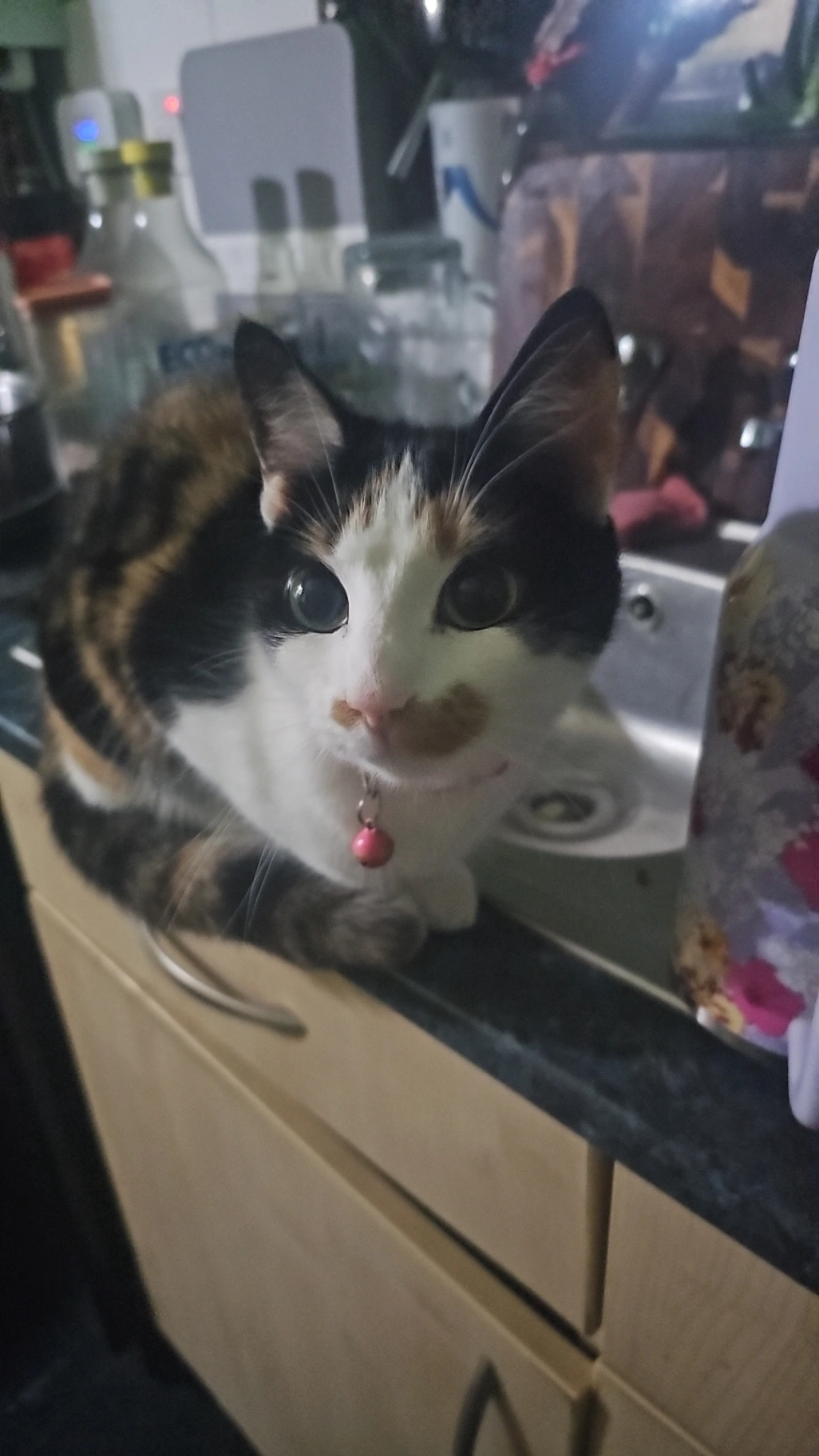 She is a young female Calico cat with a distinctive black mark under her chin. A curious explorative and has an inquisitive nature.