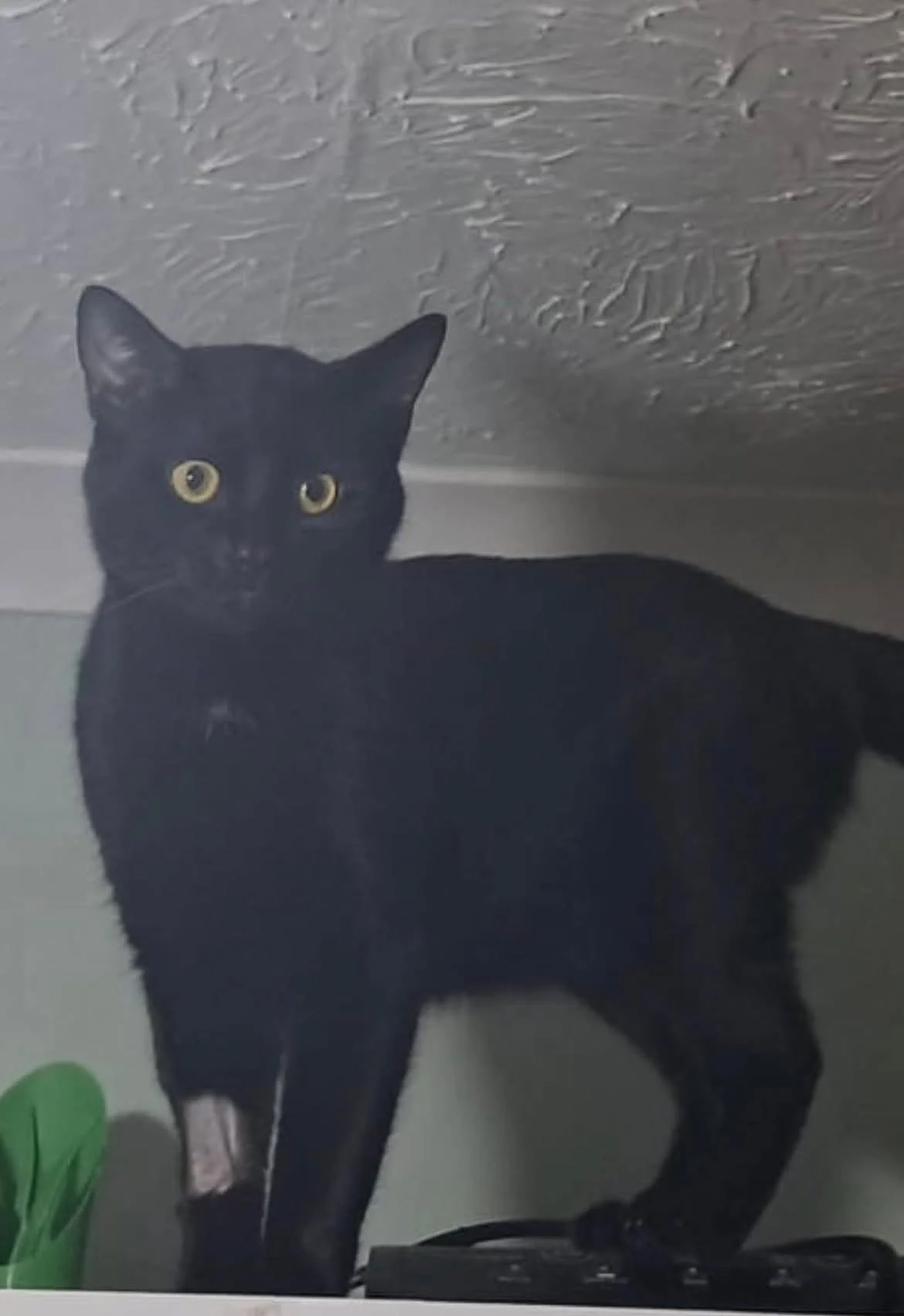 Fully black with a sprinkle of white fur on chest, 1 year old neutered male and microchipped