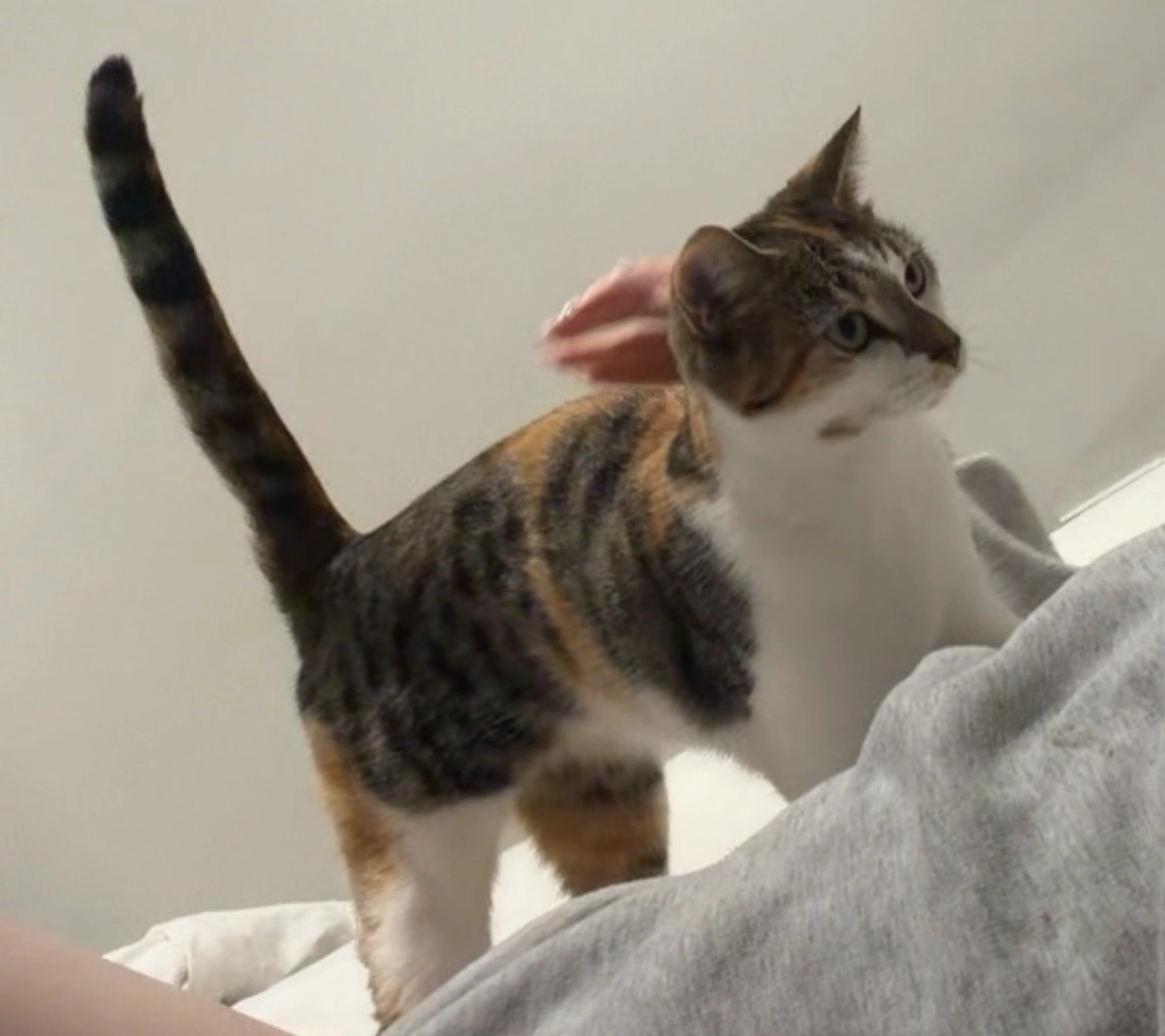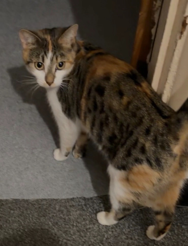 She is 2 years old, very nervous cat. She is a slender, tricoloured cat (orange, grey and white) with green eyes and a striped tail. She has more orange on the other side of her body with grey stripes.