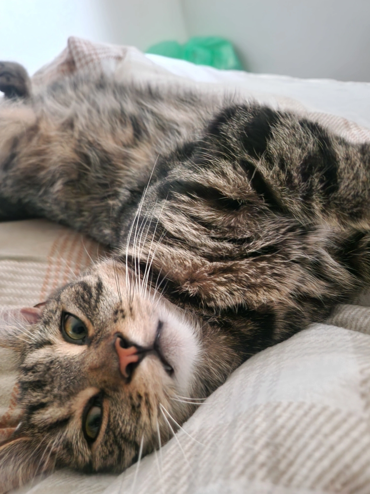 Grey and black striped tabby with shades of orange, no collar but microchipped and castrated. Timid but friendly