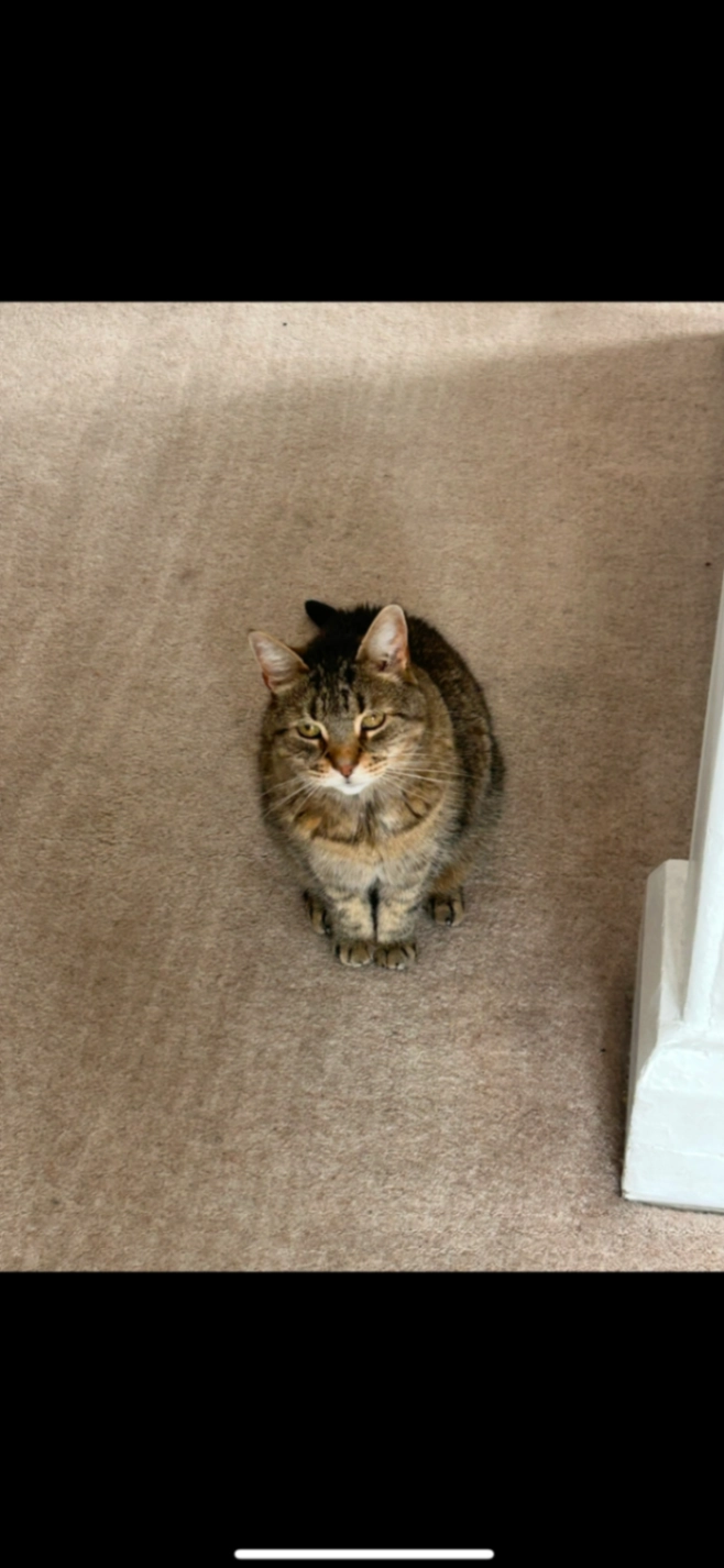 Jess is a grey/brown tabby, elderly cat with green eyes, a dark tail and black markings over her brown/grey patterned fur. She may look scruffy, disoriented or scared, and she has no collar.