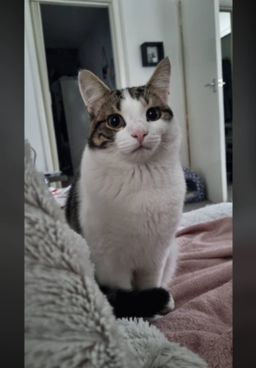 Very friendly cat we are missing him 1x black eye and tail and 2 black blobs on his side