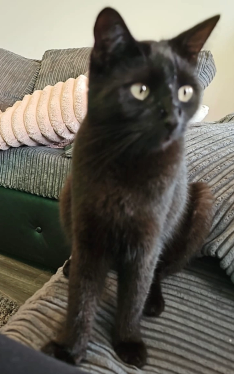 Dotty is mircochipped and spayed. she is all black with a few white hairs near her tail. she has a slight bent tail at the tip and runs slightly to the side. she is missing from essington.