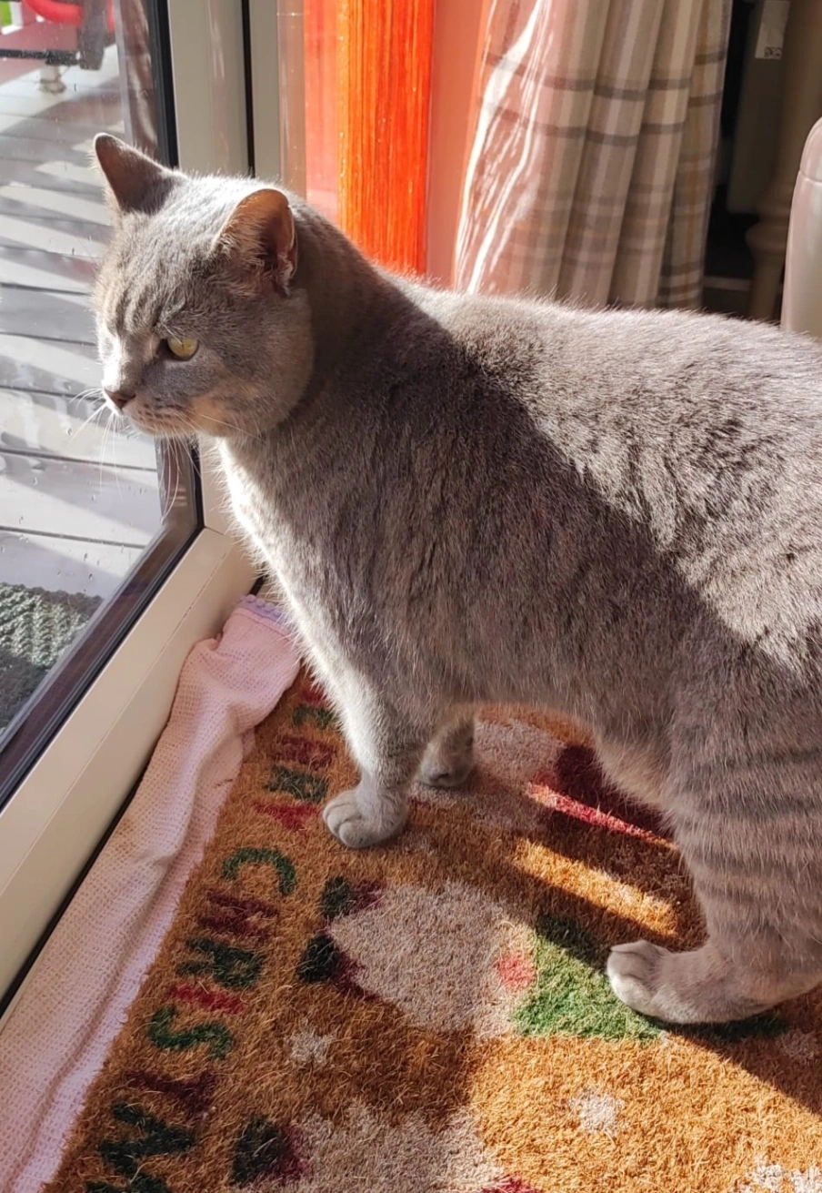 Light grey tabby with dark faded tabby markings. Large stocky cat. Tear's to right ear. White chin. Friendly walks with his head low rather than head perked up.