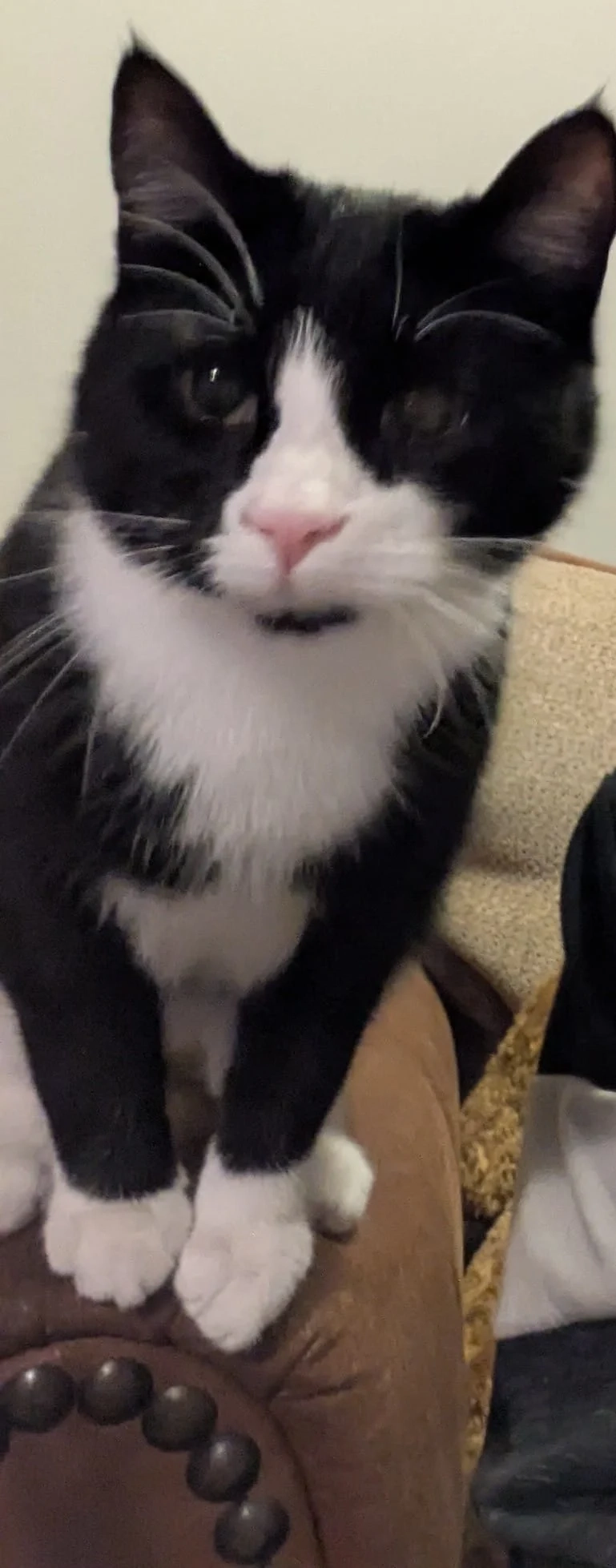 Sebastian is black and white cat with pink nose and little black spot under his chin. He is shy