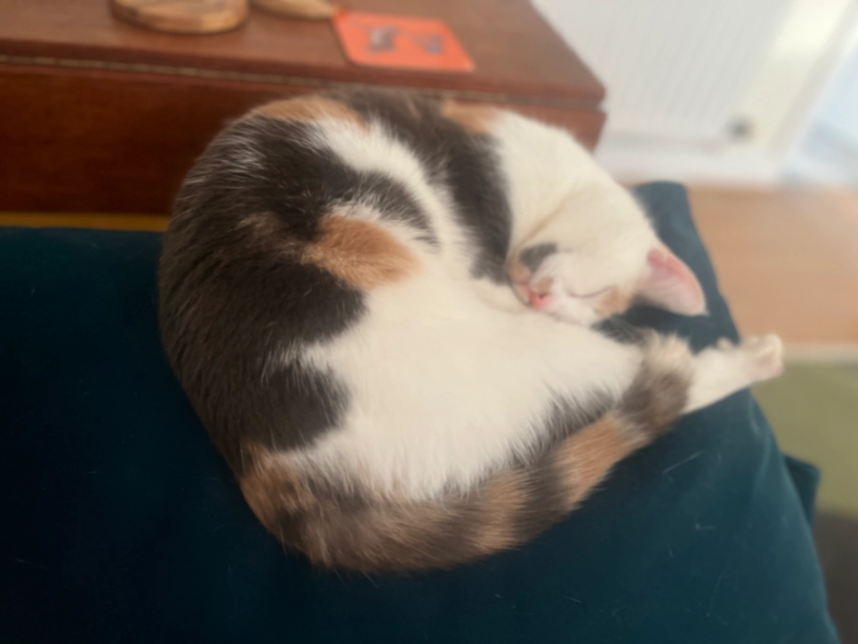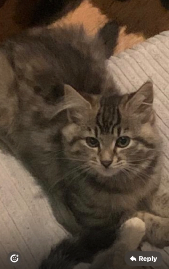 She is a small fluffy grey tabby with a large fluffy tail. She is very timid and would not come to you for attention.