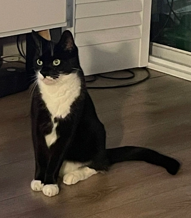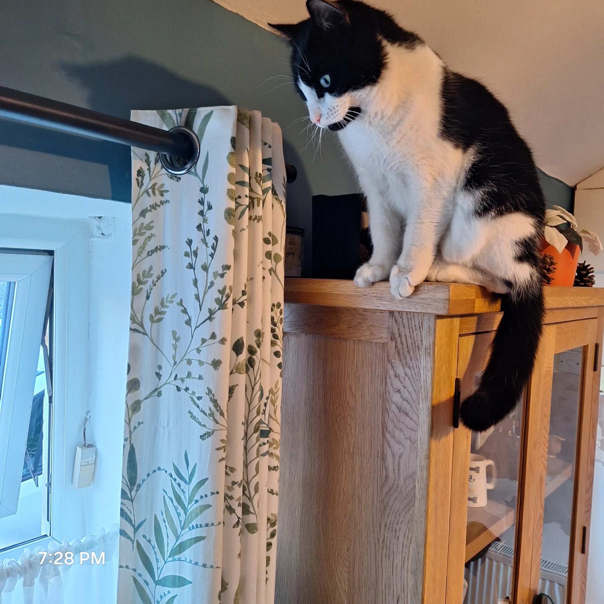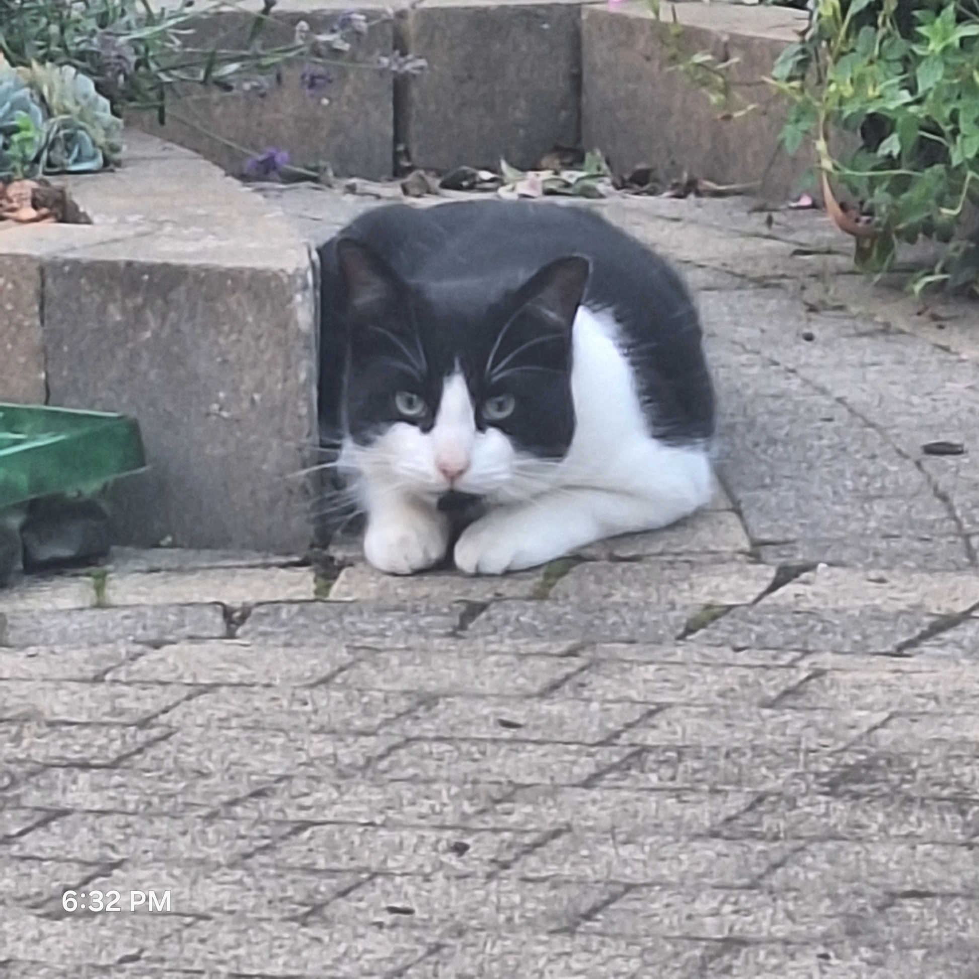 Jim is nearly two tears old and while he would wander into peoples houses, he is shy/nervous of most people. He is black and white with a little black beard.