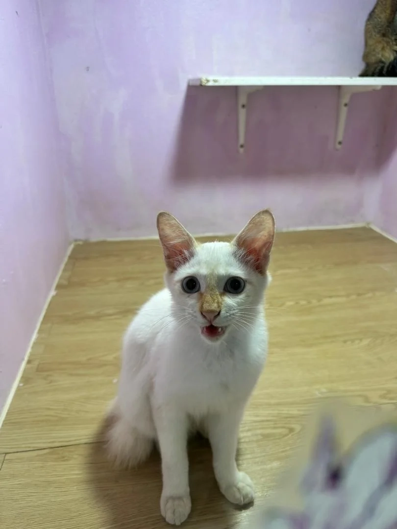 7 months old. White with orange ears and nose.