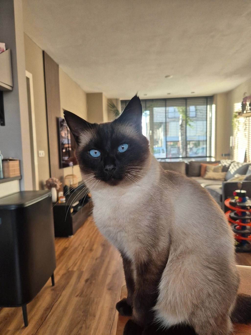 Een lieve kater van ruim 4 jaar, gecastreerd en gechipt. Heeft een kenmerkelijke miauw en is vrij groot.