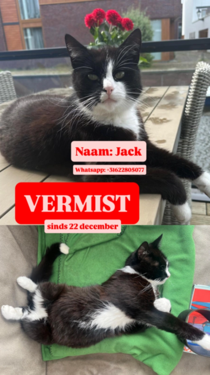 Jack is een zwart-witte kat met opvallende witte vlakken: een witte borst, witte pootjes, een witte snuit en buik, en een wit puntje op zijn staart.