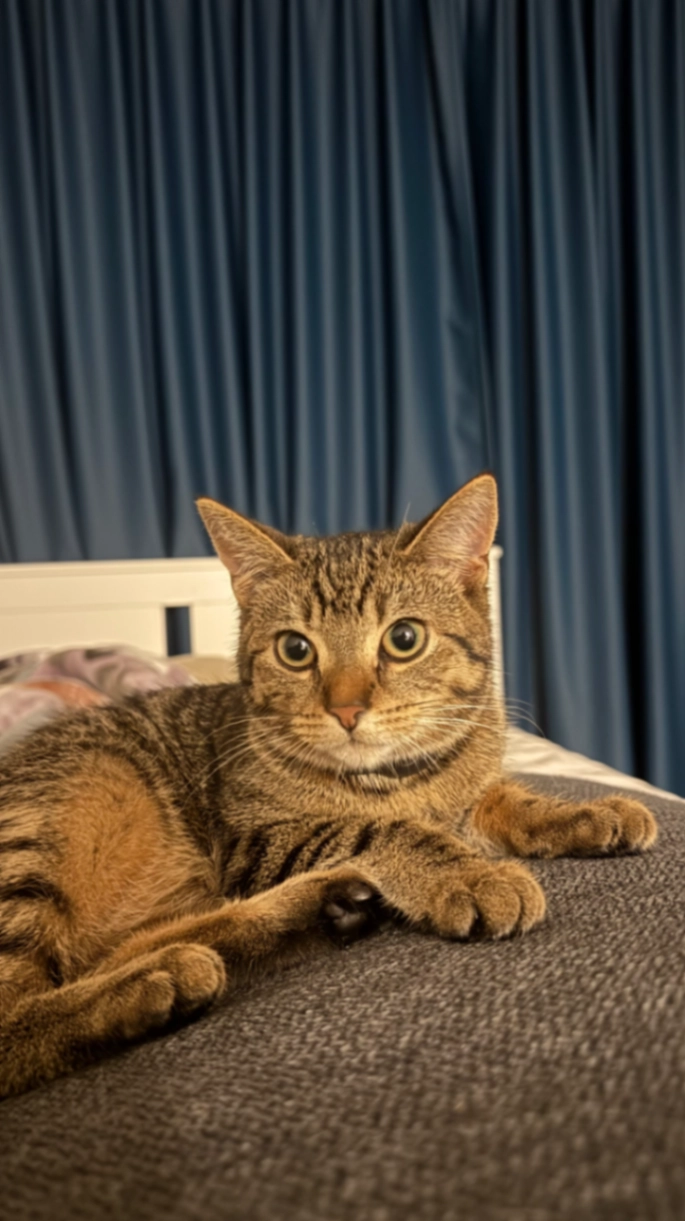 Mollie is een vijf jaar oude bruin/witte poes met vier witte pootjes. Ze heeft een halsband met een belletje en is gechipt.