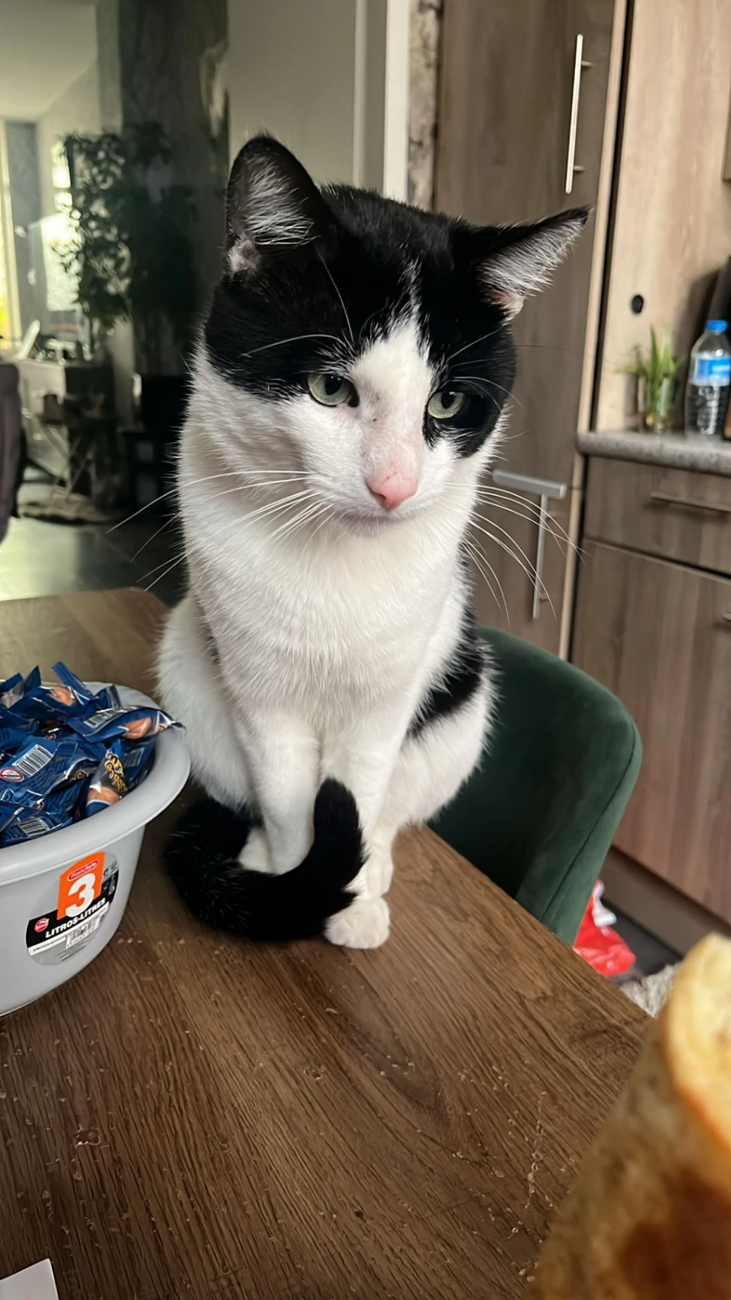 Zwarte kat, half lang haar, heeft een klein litteken op zijn neus. Luisterd naar de naam Cozmo