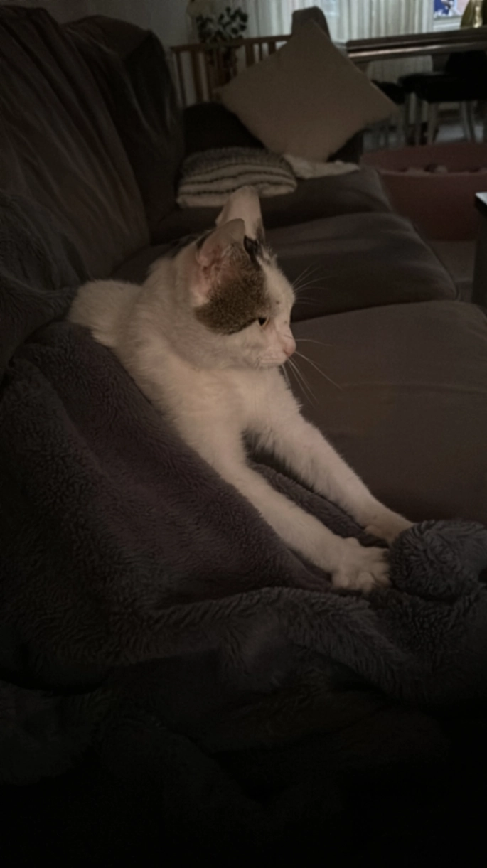 Lief katje, wit neusje, witte pootjes, verlegen maar reageert op eten