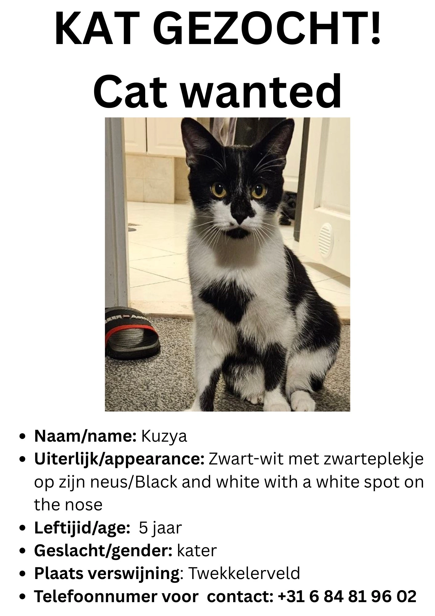 Hij is aan de antibiotika . Hij is best een bange kat buiten. Hij is vrij grote kater. 1 voor tand van hem is afgebroken. Onder zijn pootjes is helmaal zwart