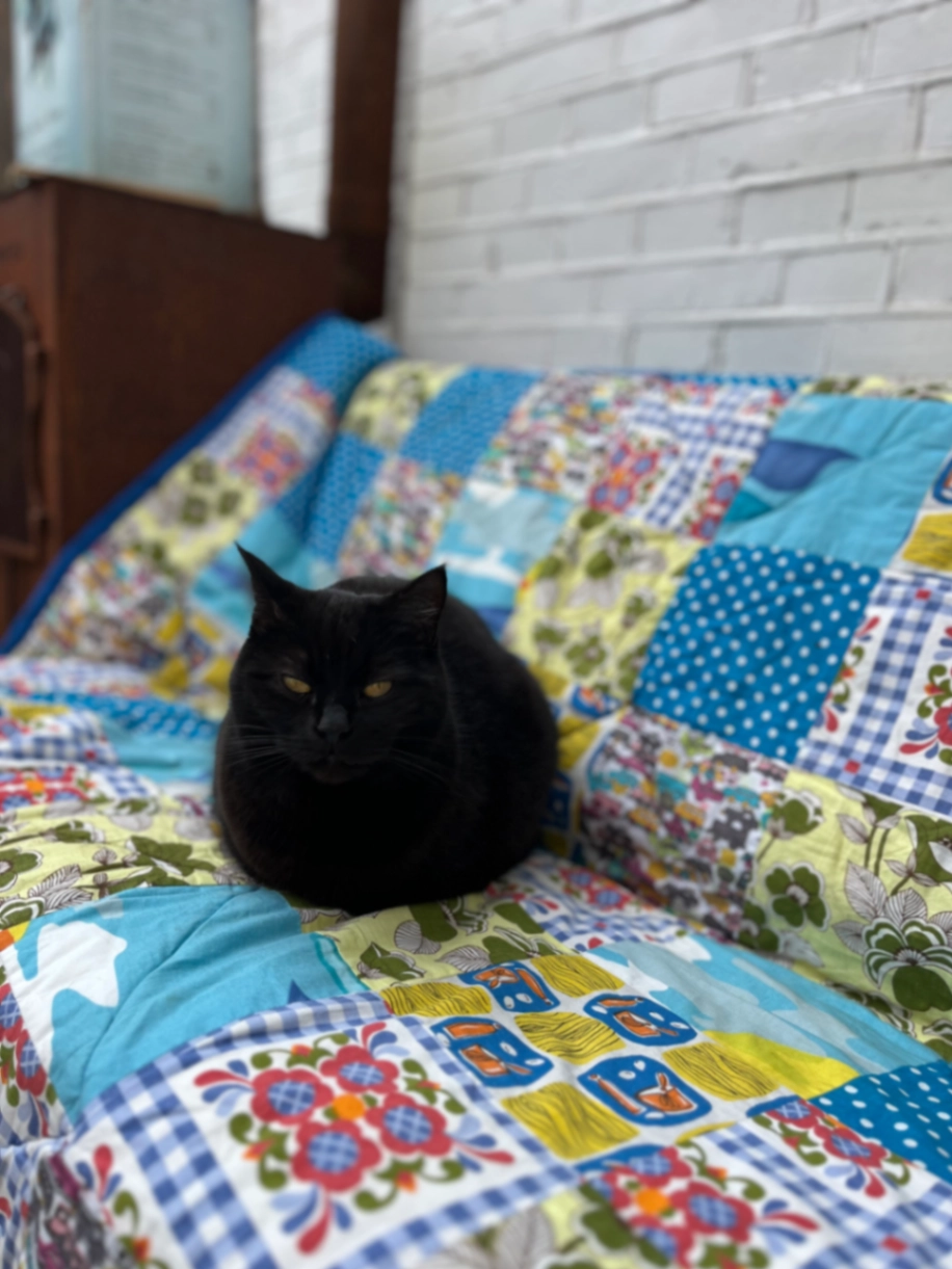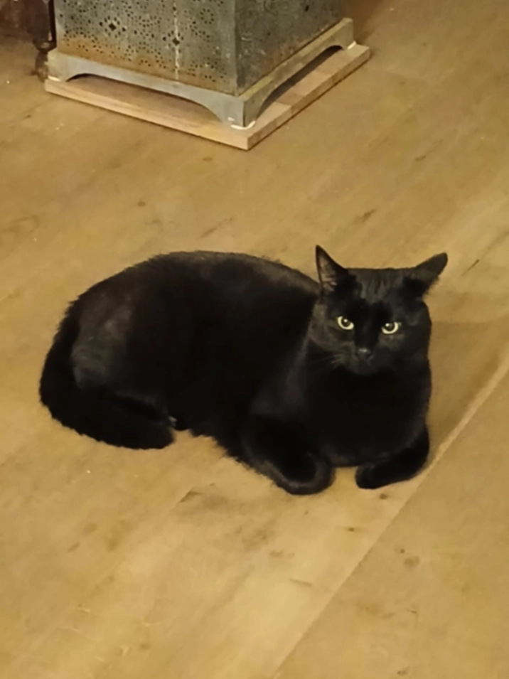 Yous, bijna 7 jaar, gesteriliseerde poes. Pluizig haar, helemaal zwart, kruising Maine Coon/Britse korthaar.