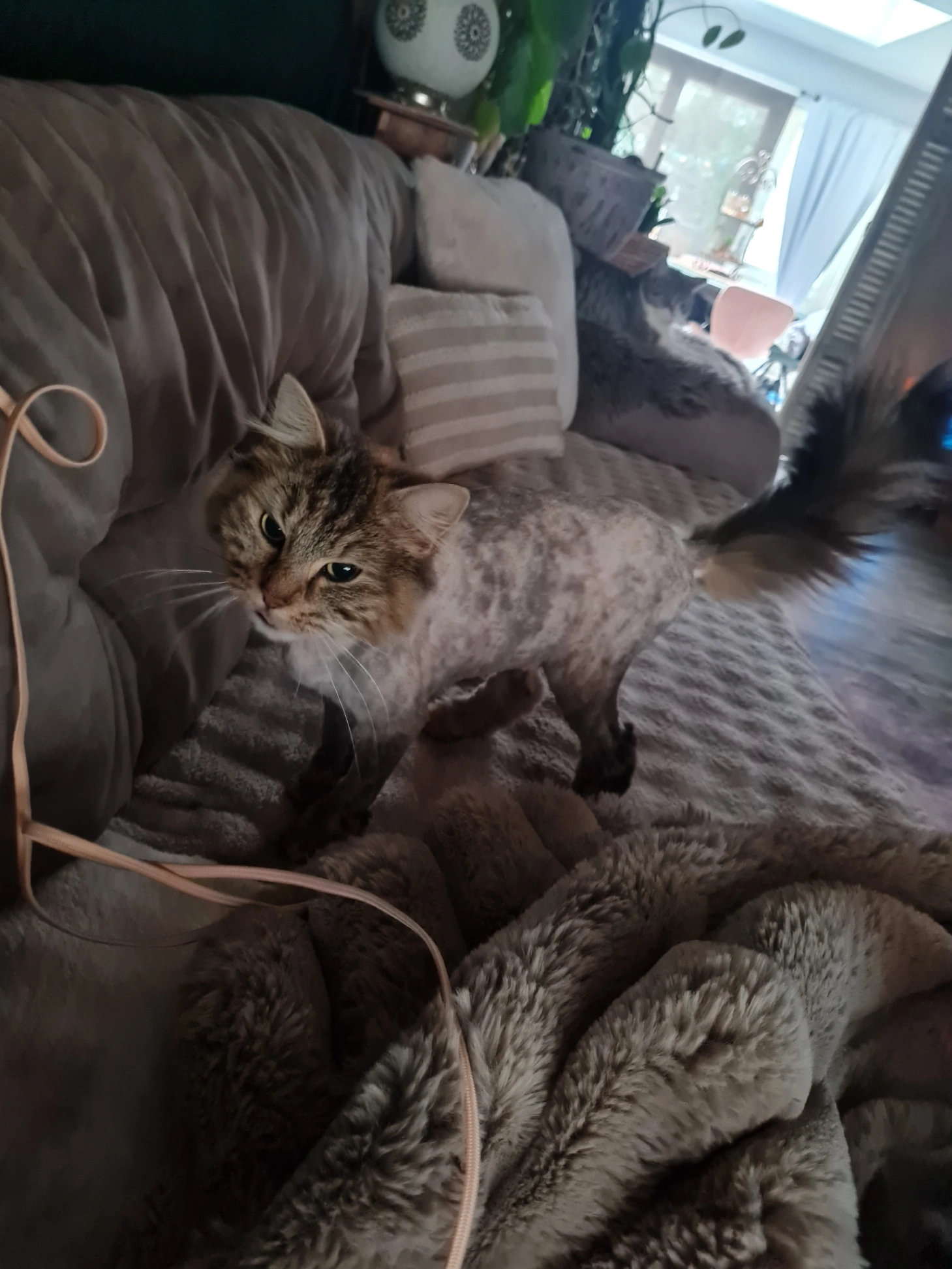 Ze is een beetje mensen schuw , ze heeft helemaal geen vacht meer sinds vrijdag . Ze is geschipt en 8s anderhalf jaar