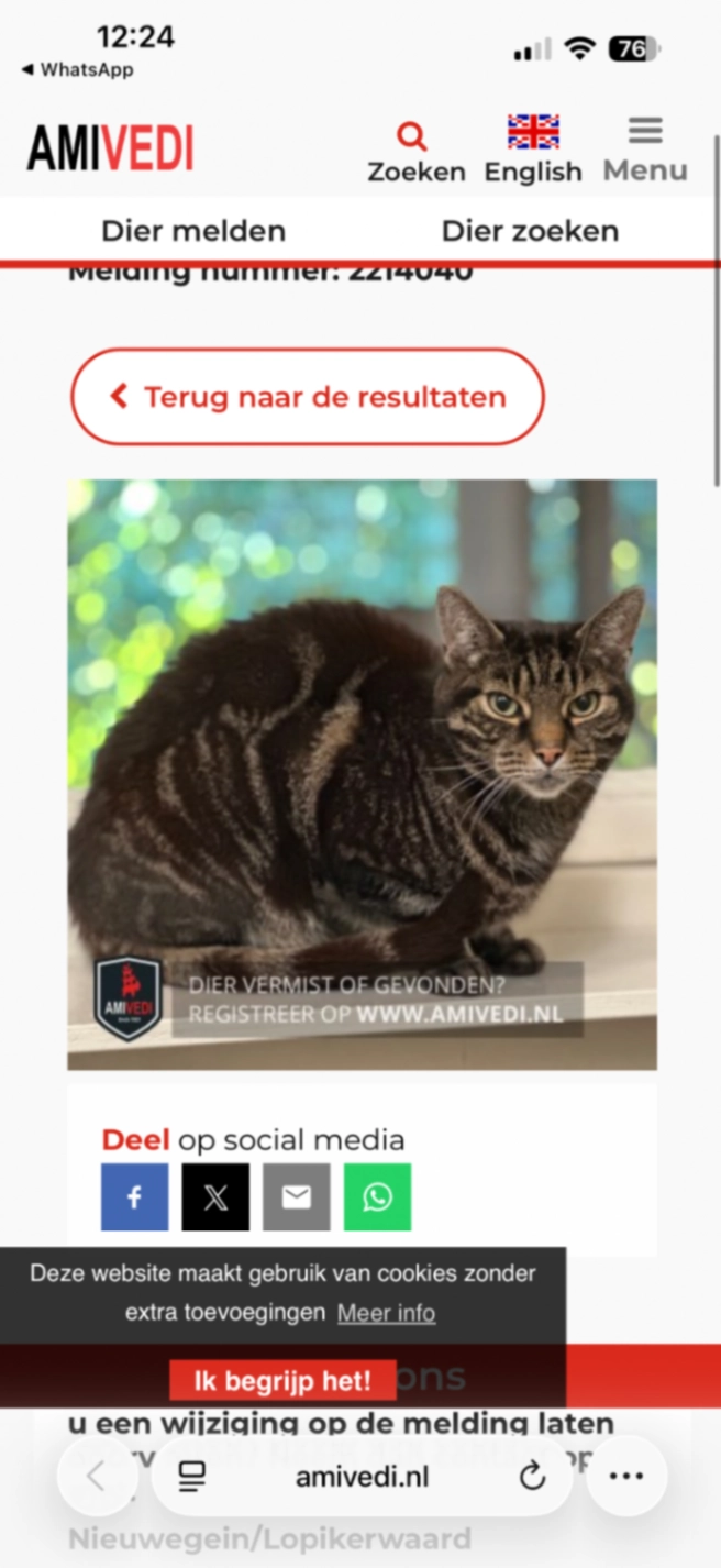 Als u haar ziet, neem alstublieft contact met ons op via e‑mail: [email protected] of telefoon: 06 2758 5841.