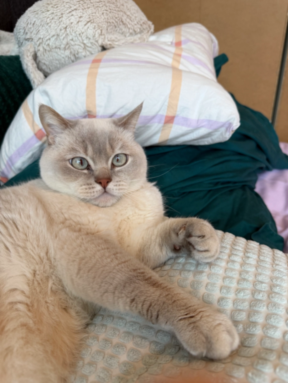 Witte britse korthaar met grijze snoet en staart. Blauwe ogen. Beetje schelig, hangbuikje door castratie