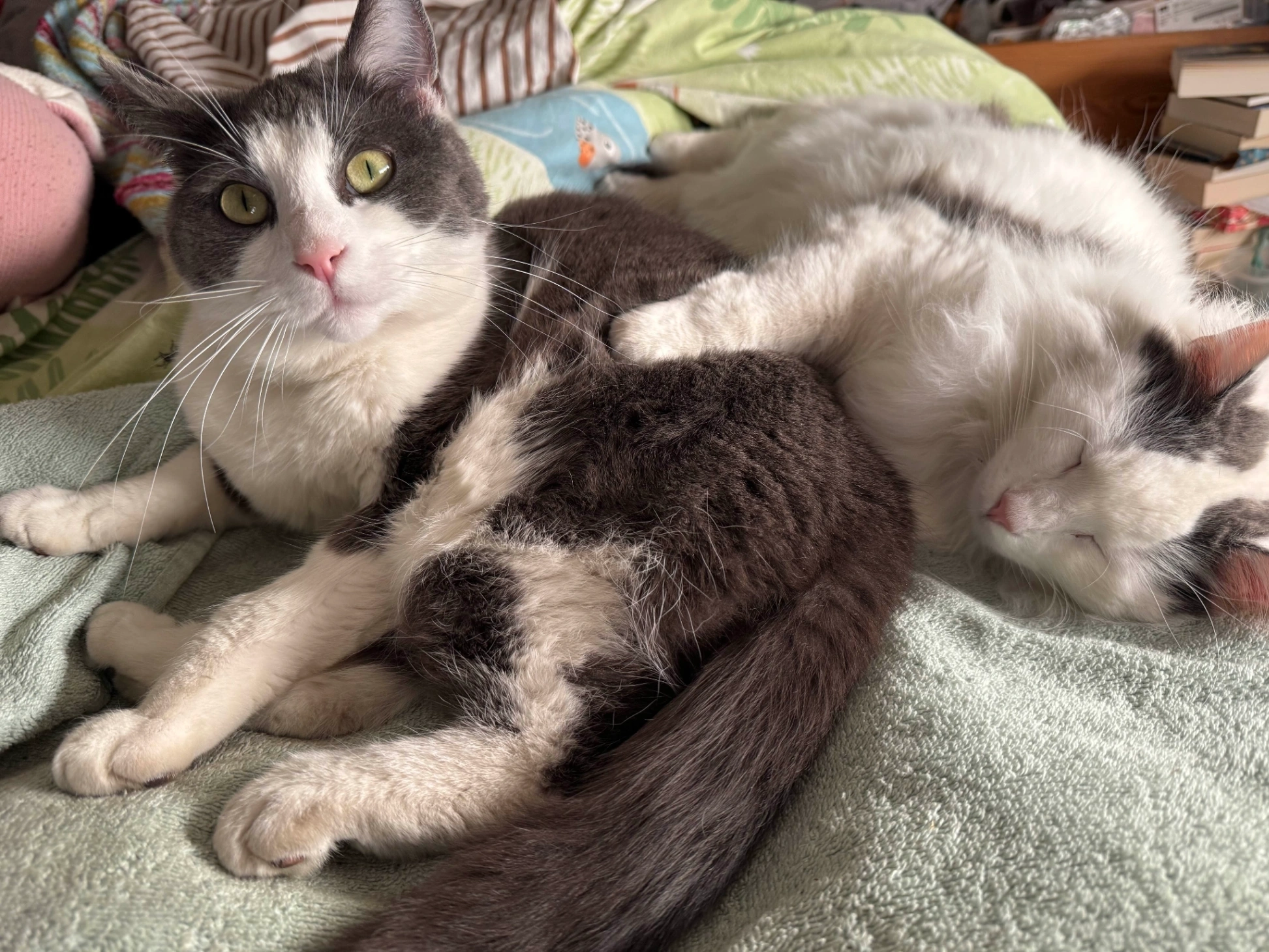Hij is een lieve kat, alleen schrikt snel. Hij heeft een zwarte streep over zijn borst/buik lopen en een zwart vlekje op zijn achterpoot.