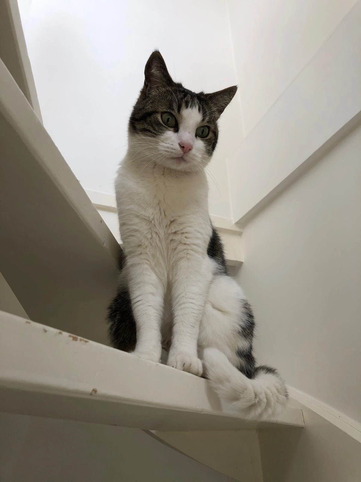 Leo een lieve bange kat. Leo is wit met donkergrijze/zwarte Oren, rug en wangen