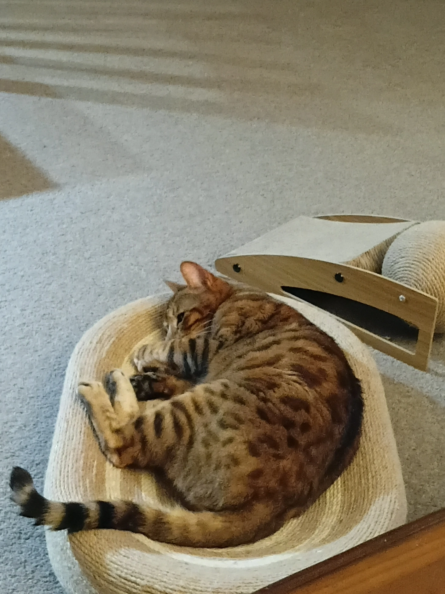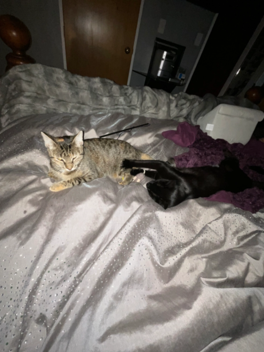 Tiger is a tabby girl with a ginger splotch by her right ear. Very much missed by all of us, especially our son and Spot the black cat pictured with her.