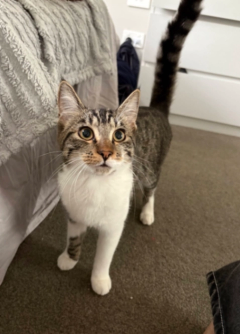 Dio is an almost two year old male tabby cat who is friendly and responds to his name. He is grey and white and has white legs with a silver patch on his right leg as well as a distinctive white patch on his side.