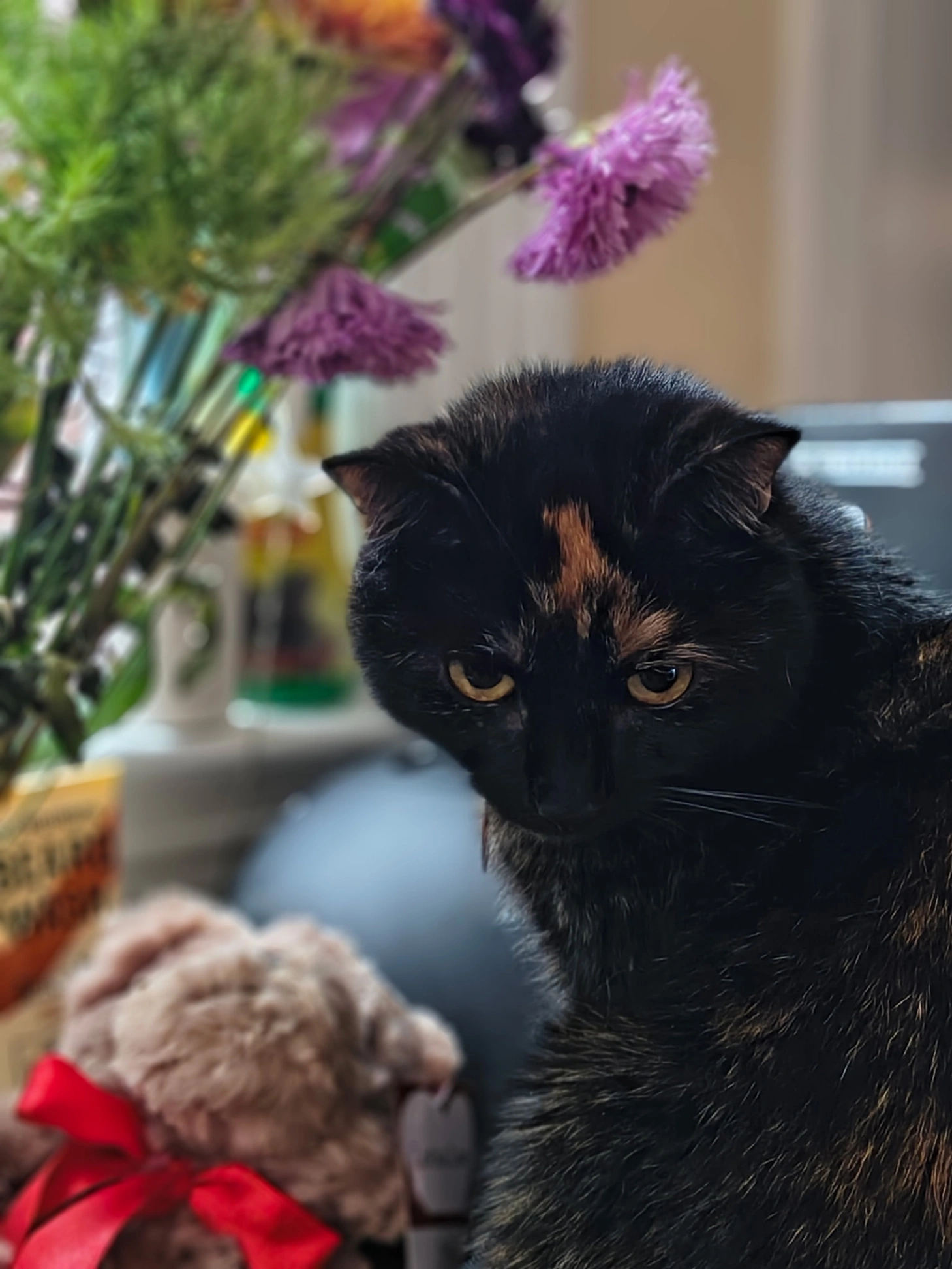 Small (8 lb) tortoise shell shorthair. Skittish, but friendly. Wearing a purple break-away collar with a tag. Tag has her name and ours with phone number to call.