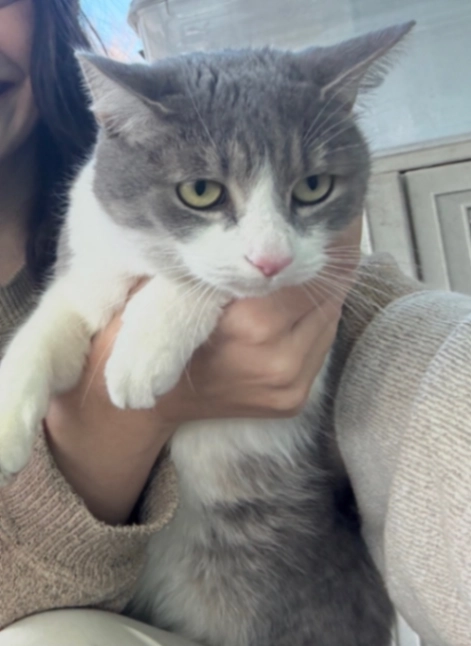 Gray back, white belly, intact male, approximately 4 to 5 pounds and 10 months old.