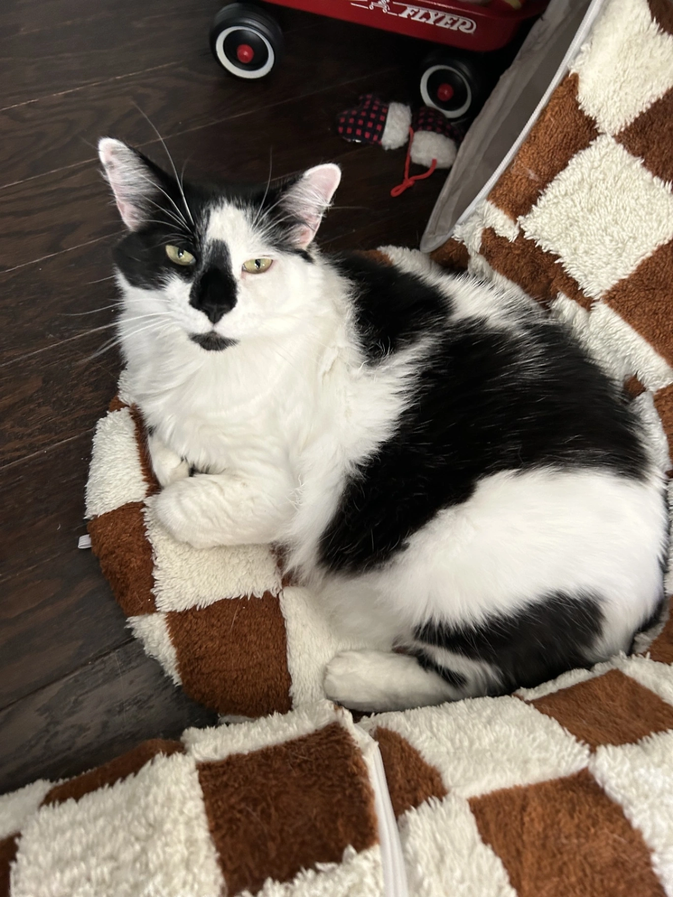 Black and white long haired, all black tail. About 20 lbs. Not skiddish but not super friendly towards new people. Vocal with loud meows/crys. Collar with watermelons and a red airtag with our contact information.